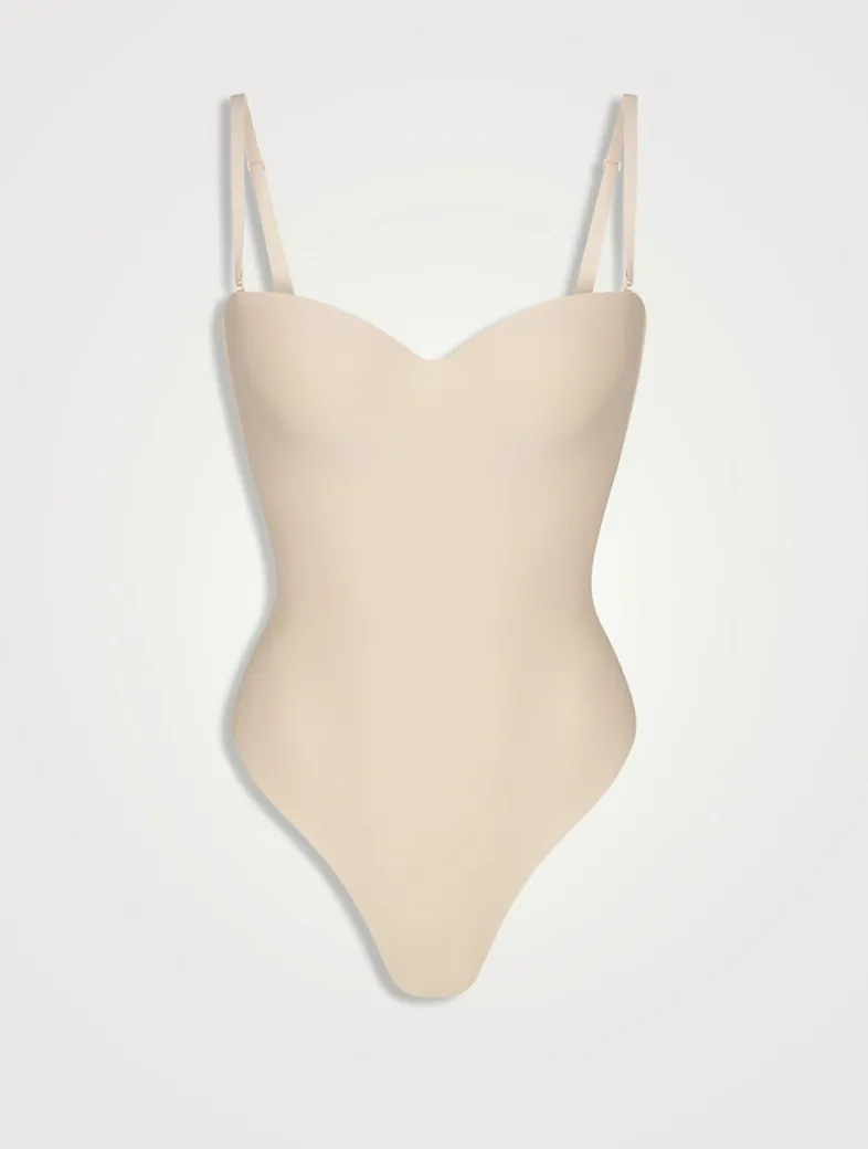 Support your curves in this sleek, contouring thong bodysuit that enhances your bust and smooths and cinches your core. Features molded, lightly-lined cups, removable adjustable straps that can be worn your way, back keyhole details with hook-and-eye closure, a thong back, and a bottom gusset with a snap closure. Fits true to size. Size down for more compression.