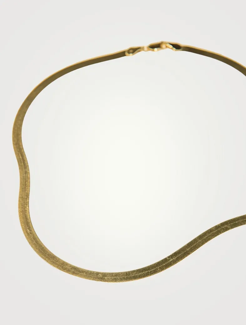 The Sleeping Venus necklace is a timeless and elegant herringbone chain, crafted from 24K gold-plated sterling silver, that glides and dips along the collarbone like liquid gold with every movement.