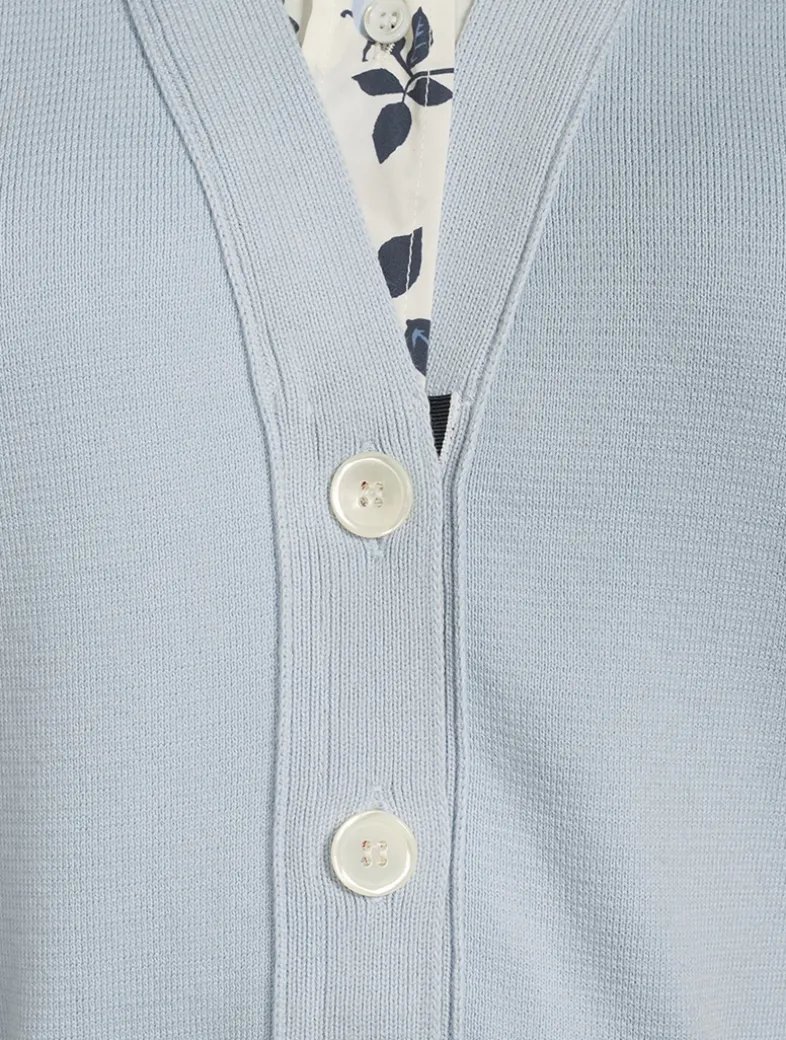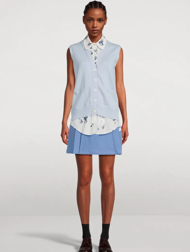 Flaunting a faux layered look, this sleeveless cotton shirt is printed with a lovely floral motif and features a rounded collar and buttoned placket. It is topped with a sleeveless cardigan, also in cotton, that has waist pockets and Thom Browne’s signature striped grosgrain ribbon running down the centre back.