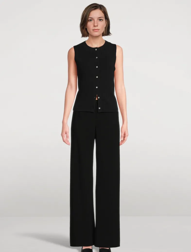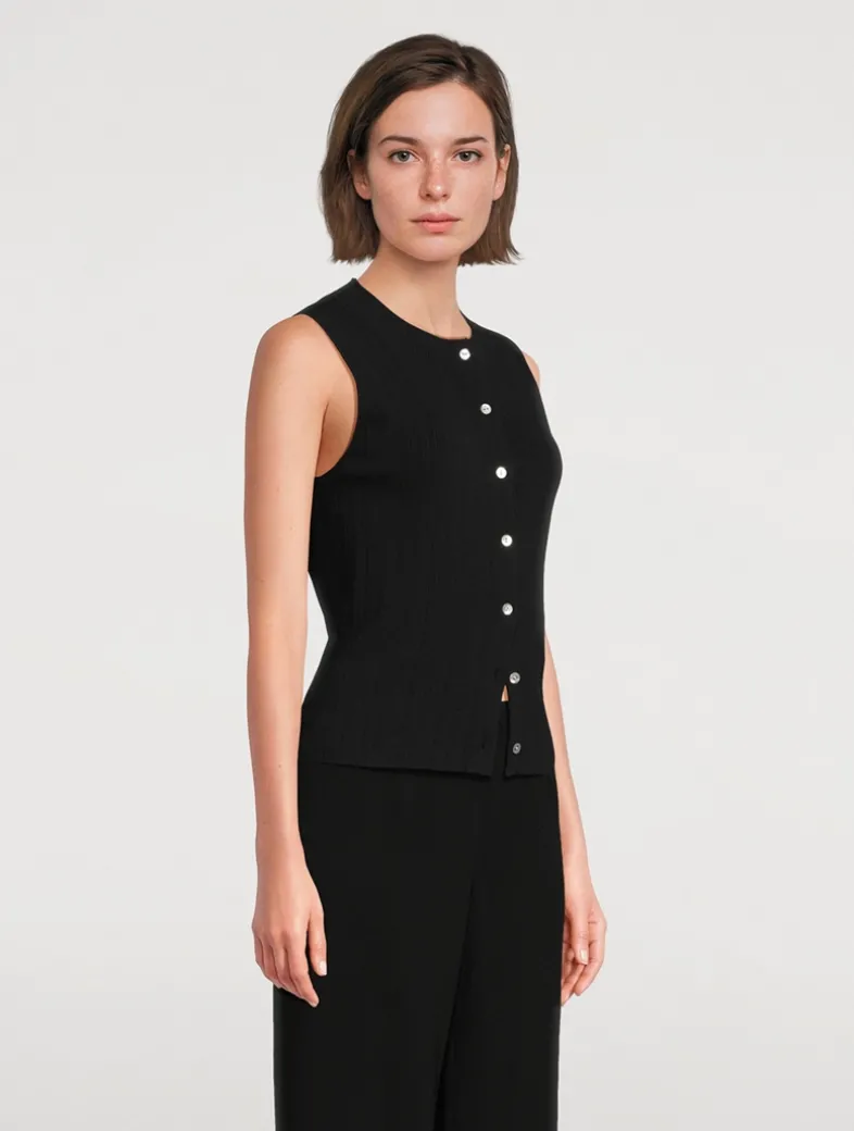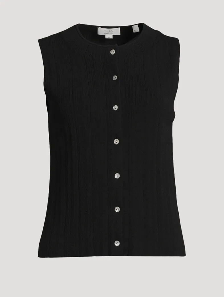 The perfect layering piece, this sleeveless sweater is knit from a cotton blend with a hint of stretch and designed with a crew neckline and buttoned placket.