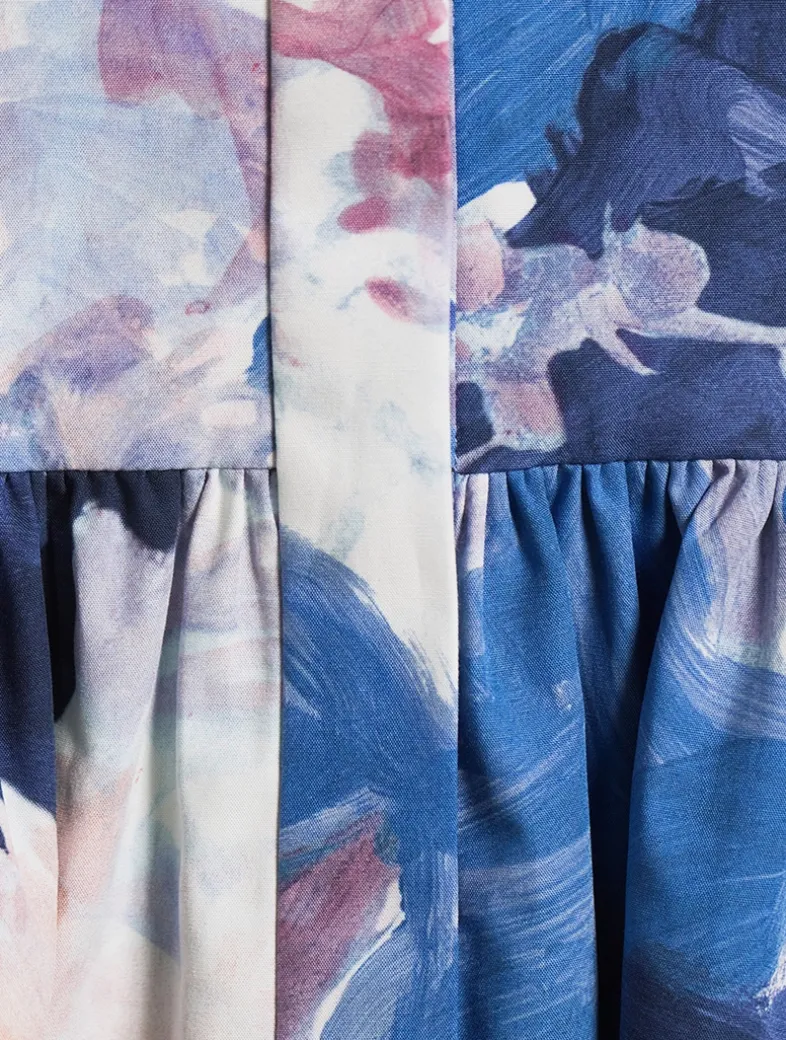 Featuring delicate hand-drawn motifs created by British contemporary artist Kaye Donachie, this mid-length dress is made from heavyweight white cotton poplin, and features hidden side seam pockets. Embellished with a large-scale floral print throughout, this fit and flare, A-line midi dress is finished with a stand collar, frilled sleeves, and a fitted waist.