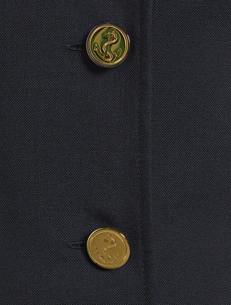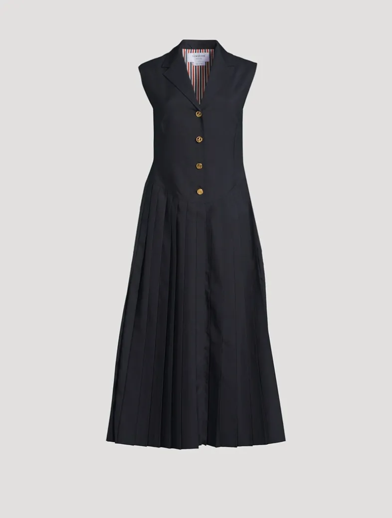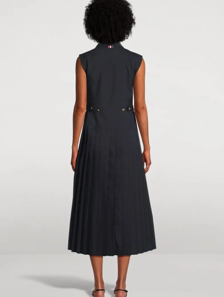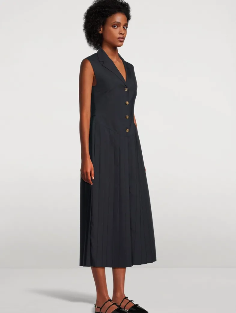 This dress, crafted from a wool blend, has a sleeveless, button-down bodice framed by a notched lapel, and a sweeping midi-length skirt with pleating.