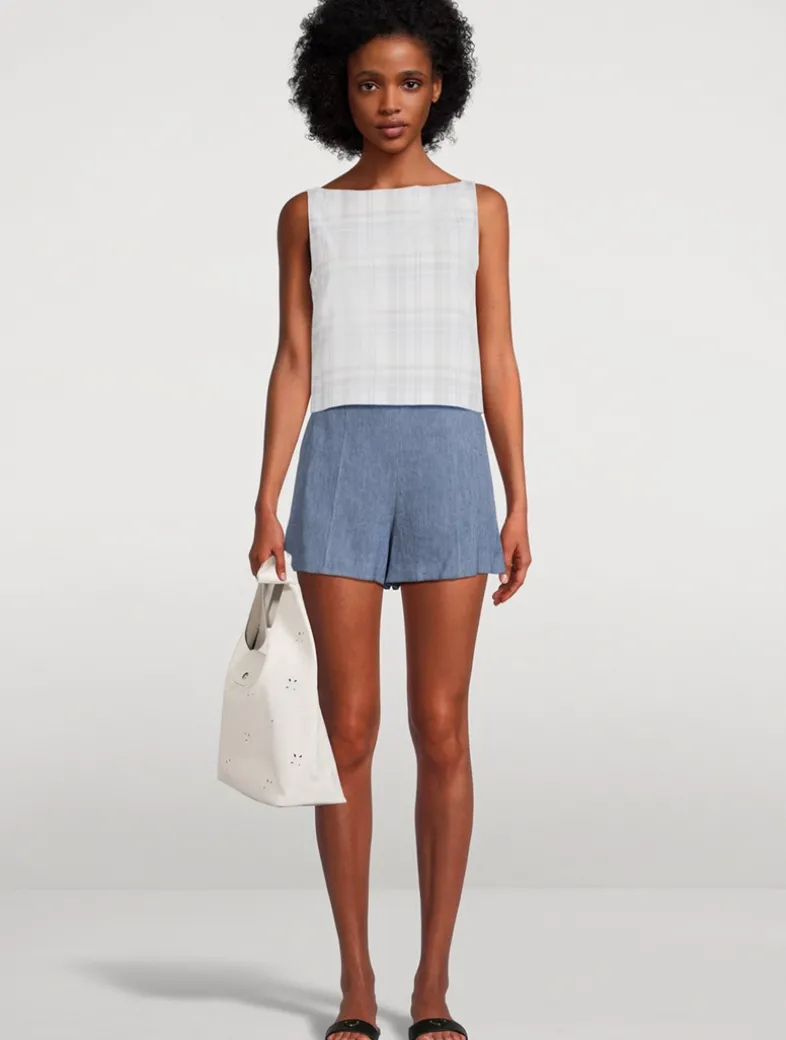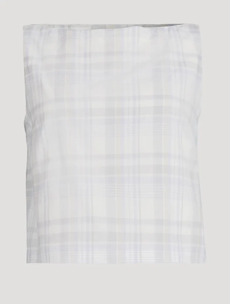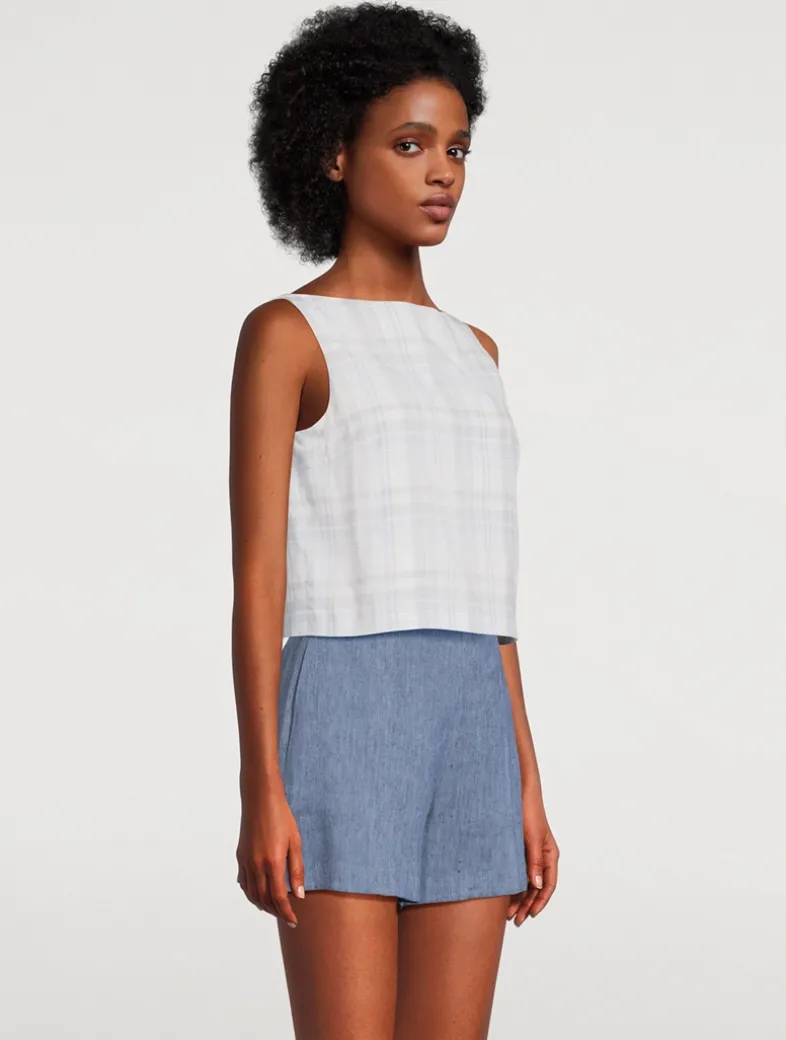 Slightly cropped to a waist length, this sleeveless top features a flattering bateau neckline and a boxy cut. Crafted from a mix of cotton and linen, the blouse is printed with a faded plaid motif.