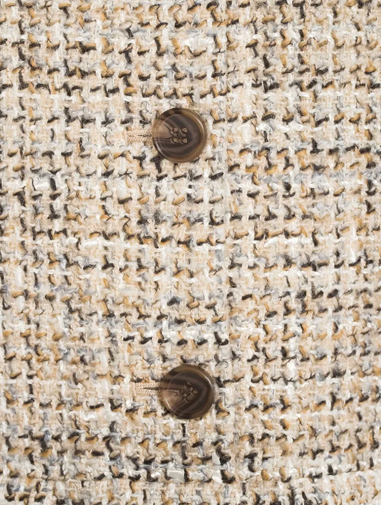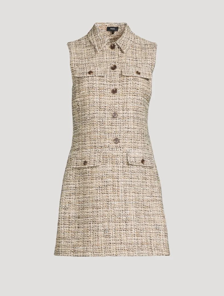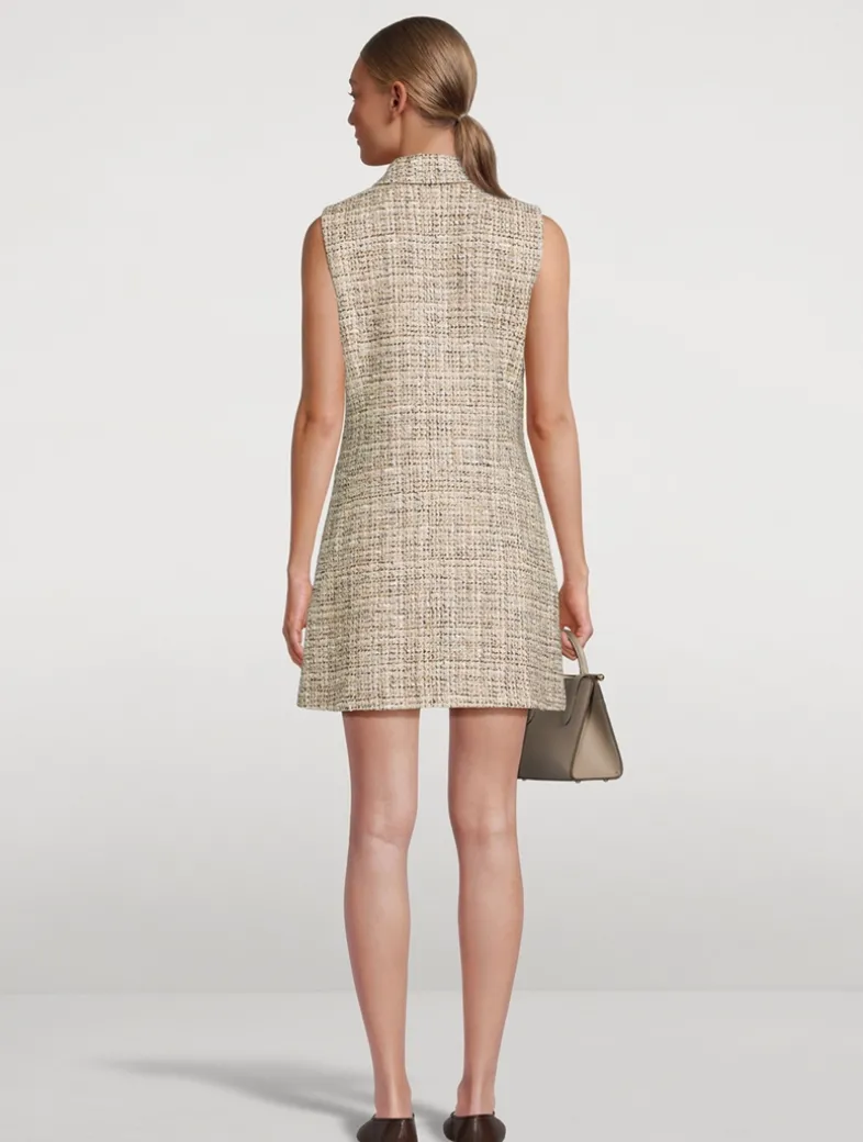 This military dress is meticulously crafted in a mixed tweed produced by a mill in Prato, Italy with a cozy blend including recycled cotton and a touch of wool for warmth. Embracing both style and function, its fit-and-flare silhouette features a partial button front closure to meet a pointed collar, a pair of front flap pockets, and hip slip pockets. Finished with a side zipper closure.