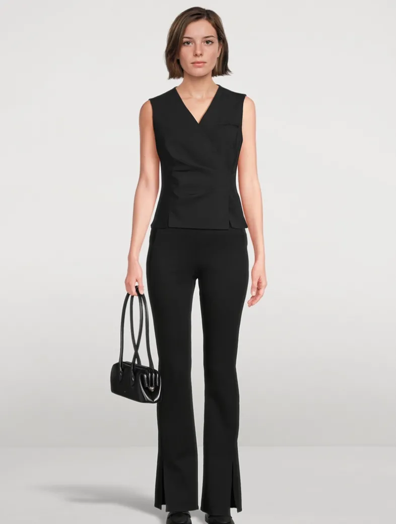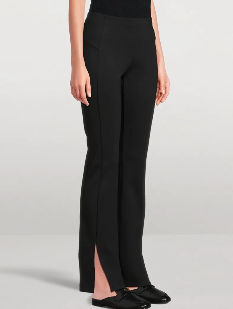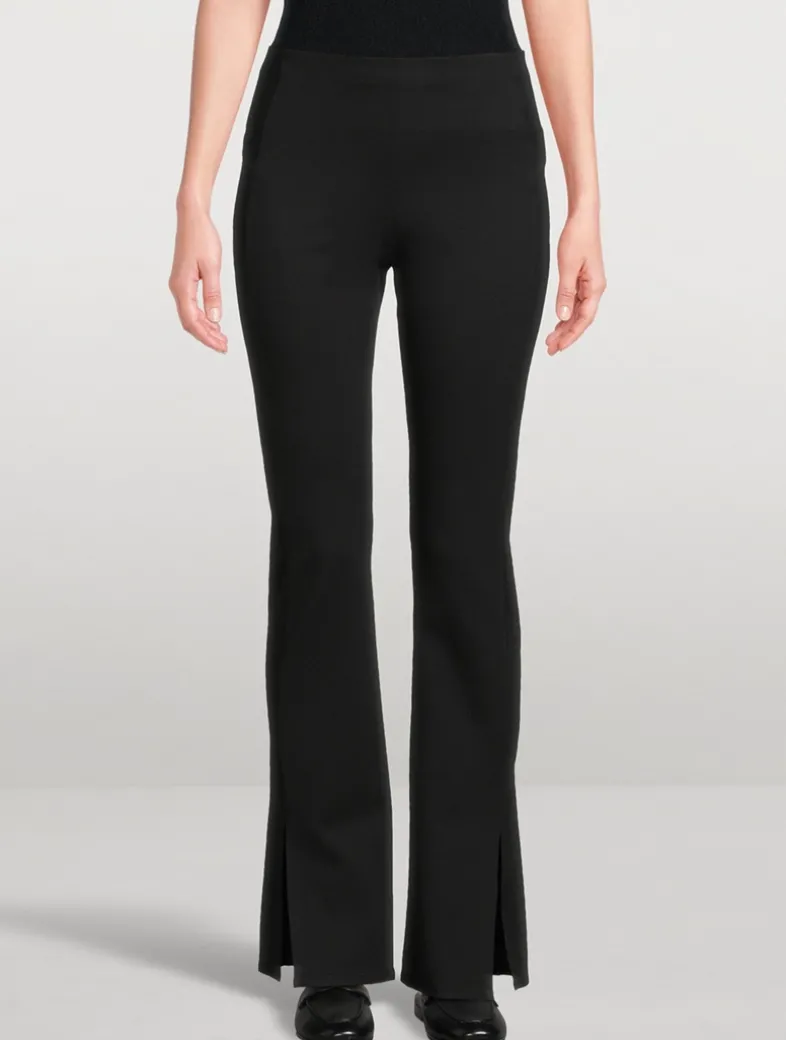 These flared-leg leggings feature hem slits and a curved pull-on waistband for a flattering, comfortable fit, all crafted from a soft stretch fabric.