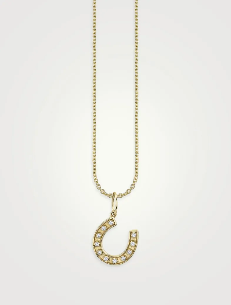 Crafted with a classic 14k gold chain, this necklace features a sparkling diamond horseshoe pendant.