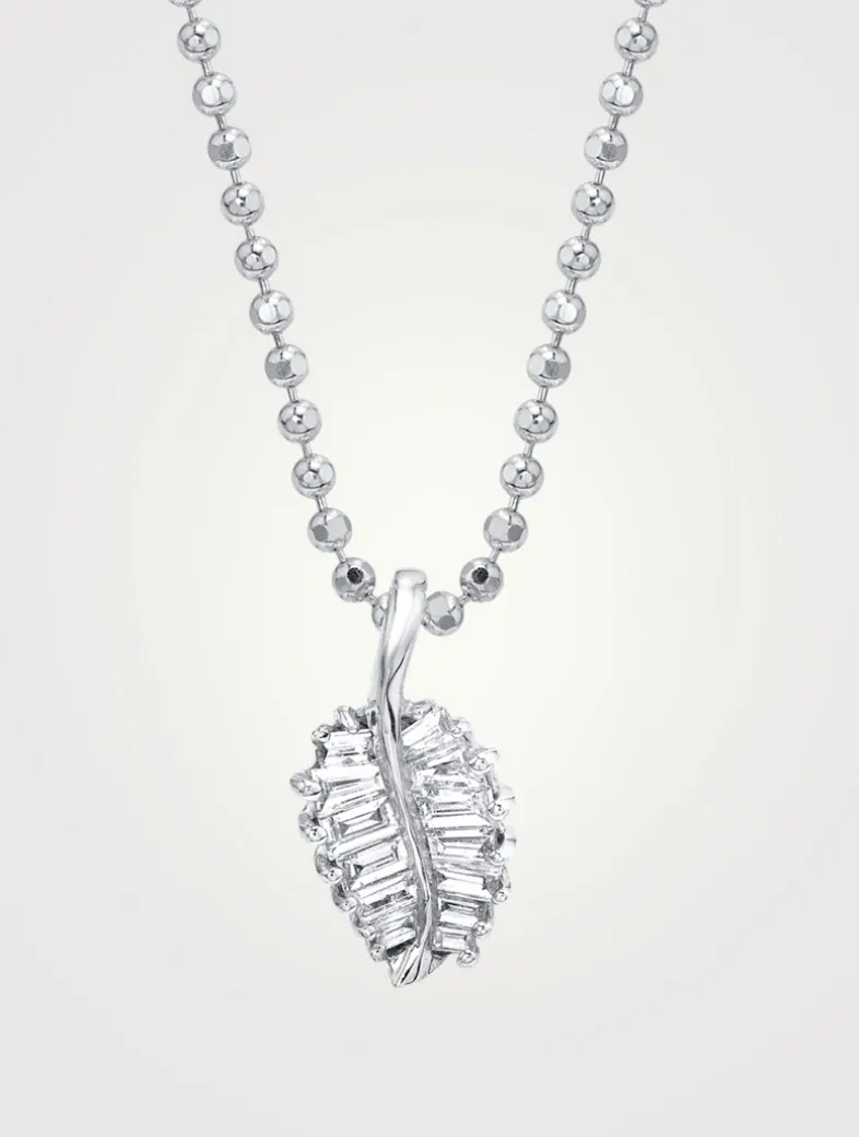 Set on a ball chain, this necklace features a small leaf pendant with baguette-cut diamonds.