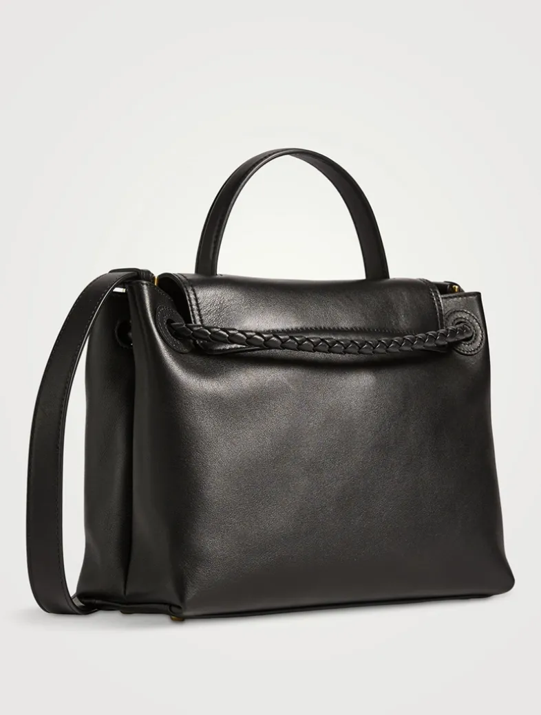 This top handle bag is crafted in Italy from silky calfskin leather with a bonded suede lining. It features a hidden hook closure, allowing the flap to be closed in the front or attached to the interior intrecciato pocket. A sliding shoulder strap and an adjustable and detachable crossbody strap for multiple carry options.