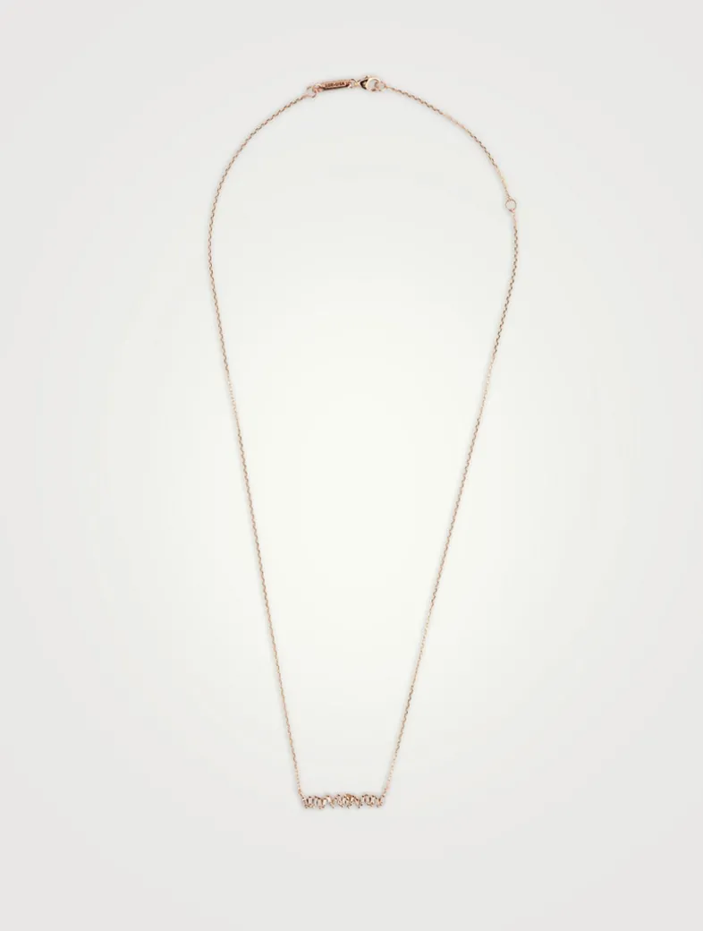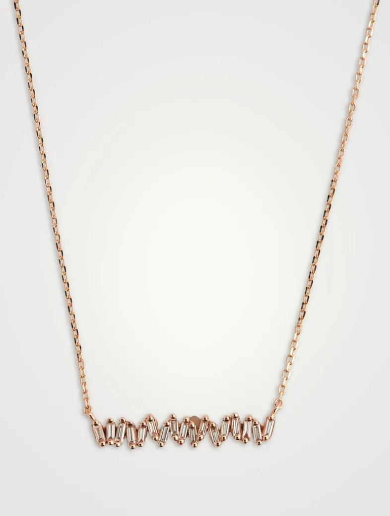 Chain necklace features bar pendant with baguette-cut diamonds in signature fireworks setting.