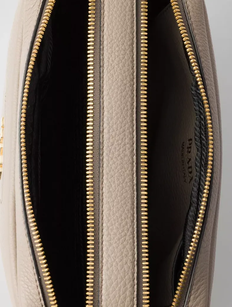 Two compartments Adjustable, detachable logo-print woven tape shoulder strap, length 95 cm. Maximum length 107 cm – Minimum length 56 cm – Maximum drop 56 cm – Minimum drop 35 cm Detachable, adjustable leather shoulder strap. Maximum length 112 cm – Minimum length 102 cm – Maximum drop 50 cm – Minimum drop 45 cm Metal hardware Lettering logo on the front Zipper closure Logo-print nylon lining with patch pocket