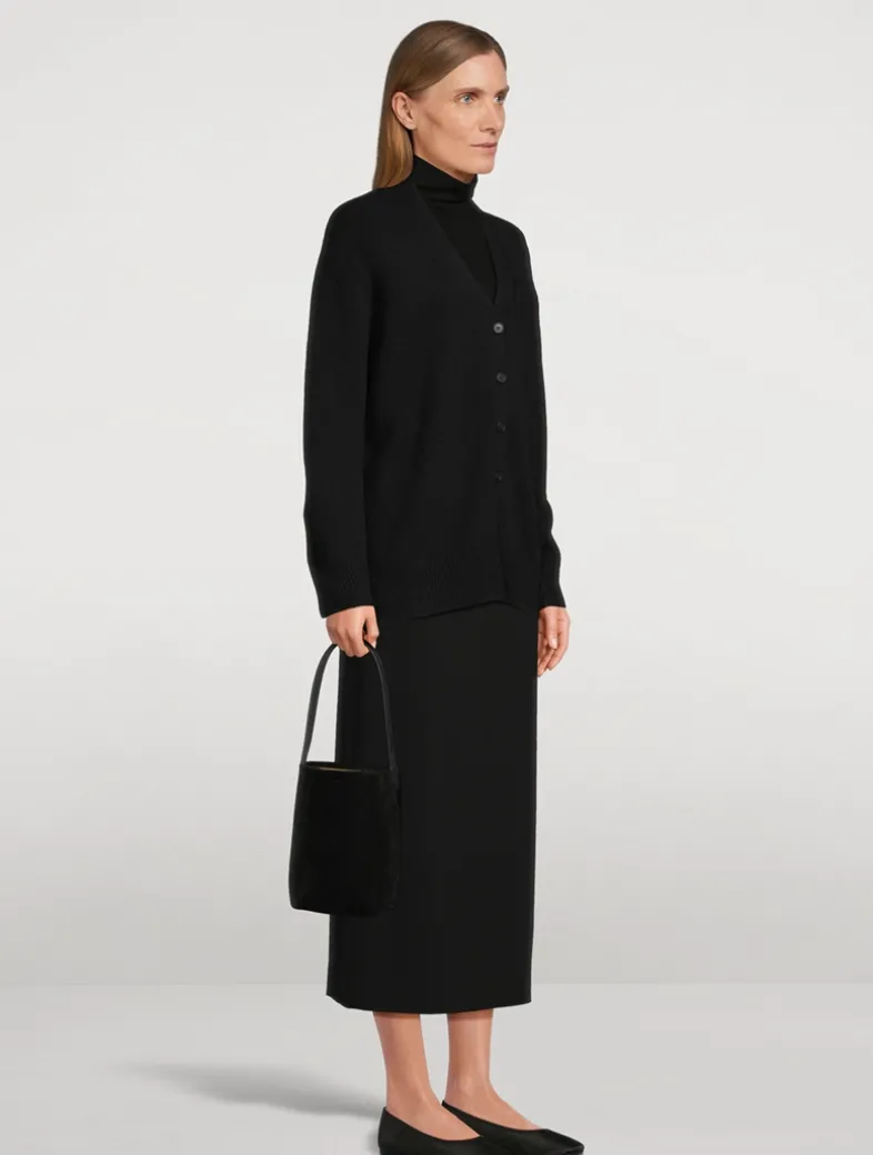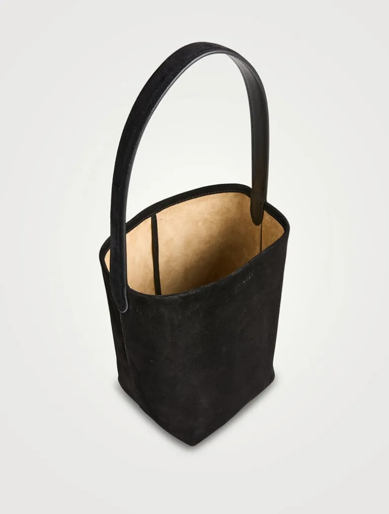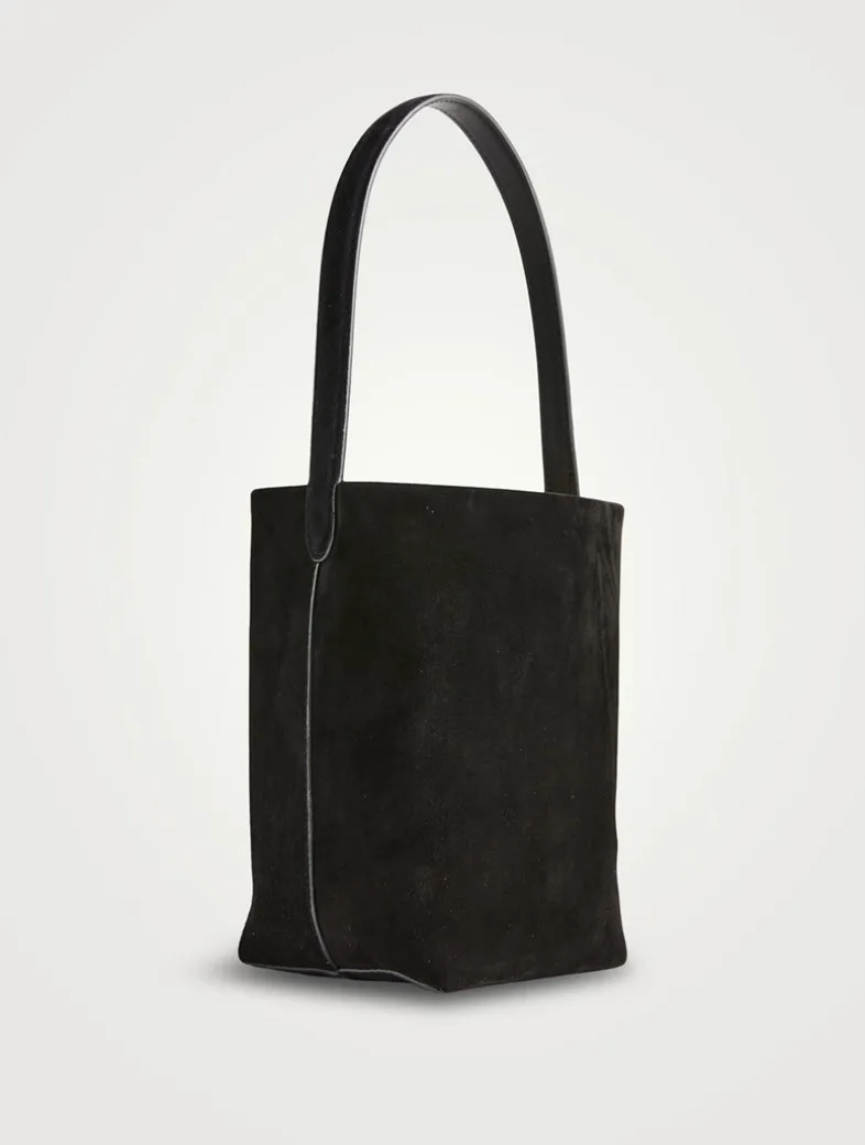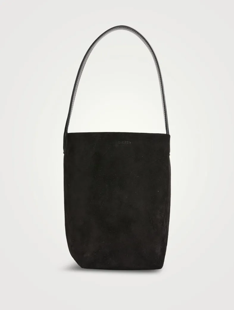 Made from plush suede, this deep tote bag is styled with a flat leather top handle and an interior toggle closure.