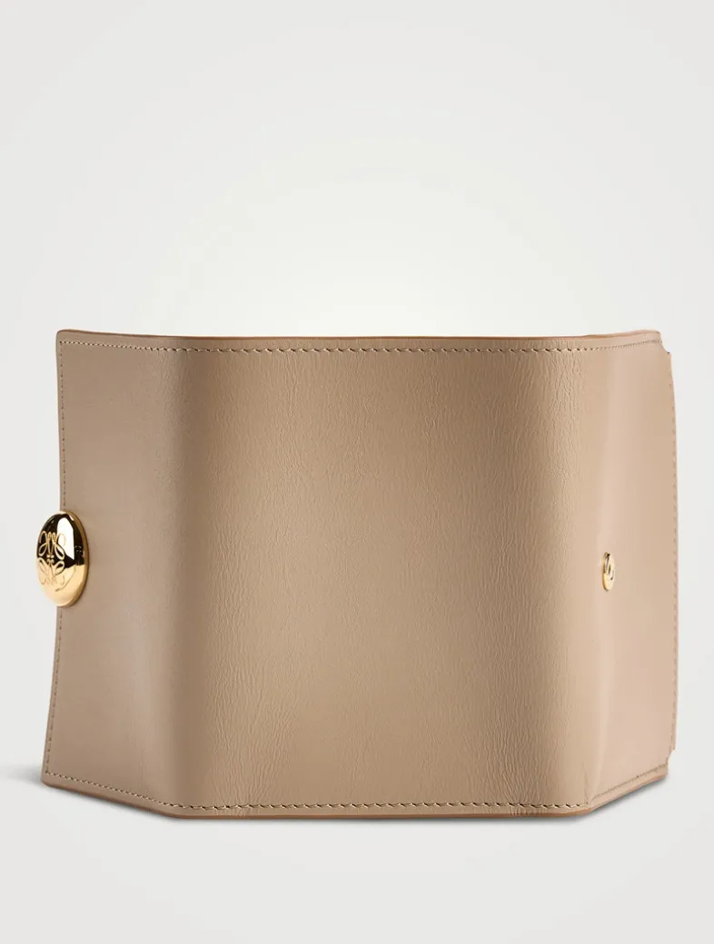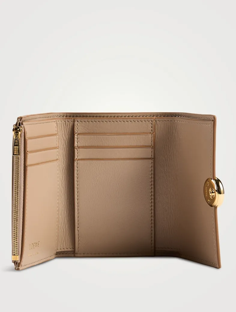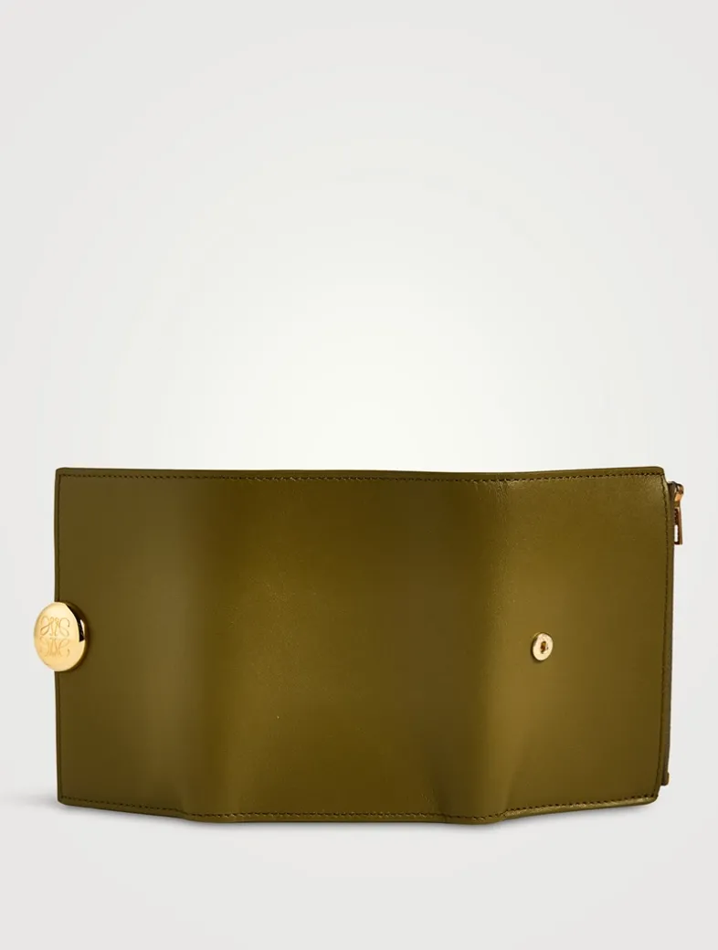Made in Spain, this small wallet is crafted in shiny nappa calfskin featuring a signature Pebble closure. It has a zipped coin compartment, six card slots, two small pockets, and one larger.