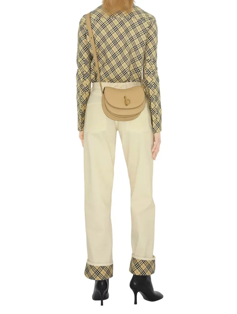 A structured bag made in Italy from grainy calf leather with an embossed check leather lining in contrasting vine green. The saddle style has a curved shape and arched profile with prongs at the strap inspired by hardware found on equestrian reins. Our signature ‘b’ closure pivots in place to secure the flap and the adjustable strap switches the design from a shoulder to a crossbody bag.