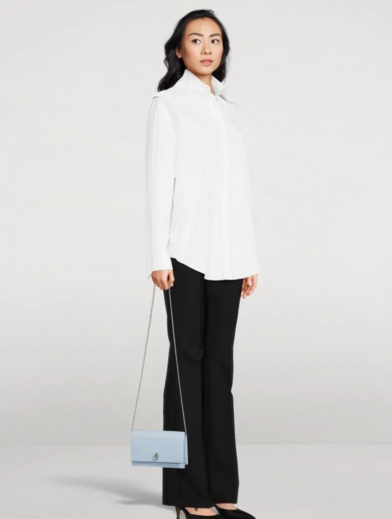 Crafted in shiny calfskin with an embossed croc finish, this Small Skull bag is detailed with petite metal skull hardware and mixed-metal chain details. It has one central compartment and one card slot.