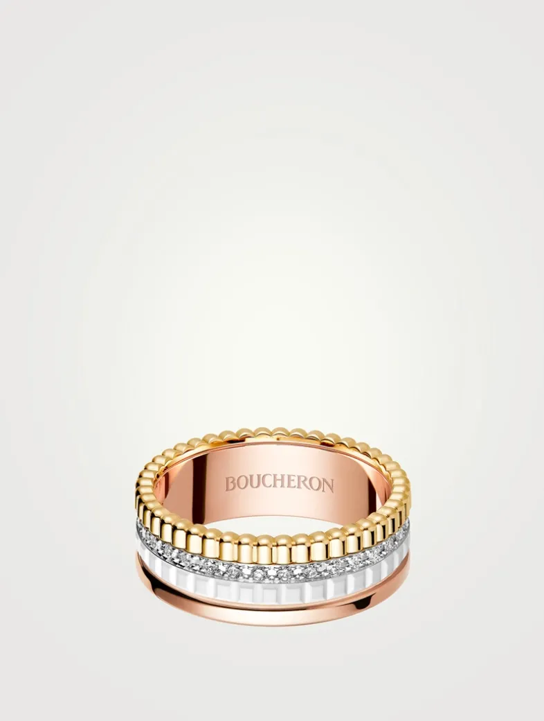 Four-row ring with row of diamonds and signature facet and grosgrain motifs.