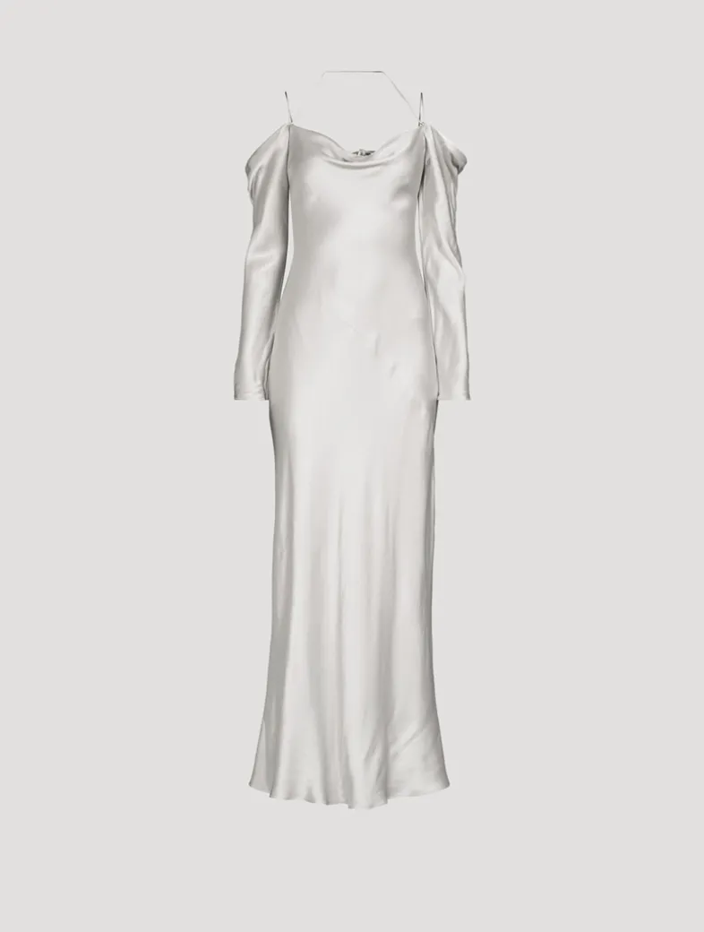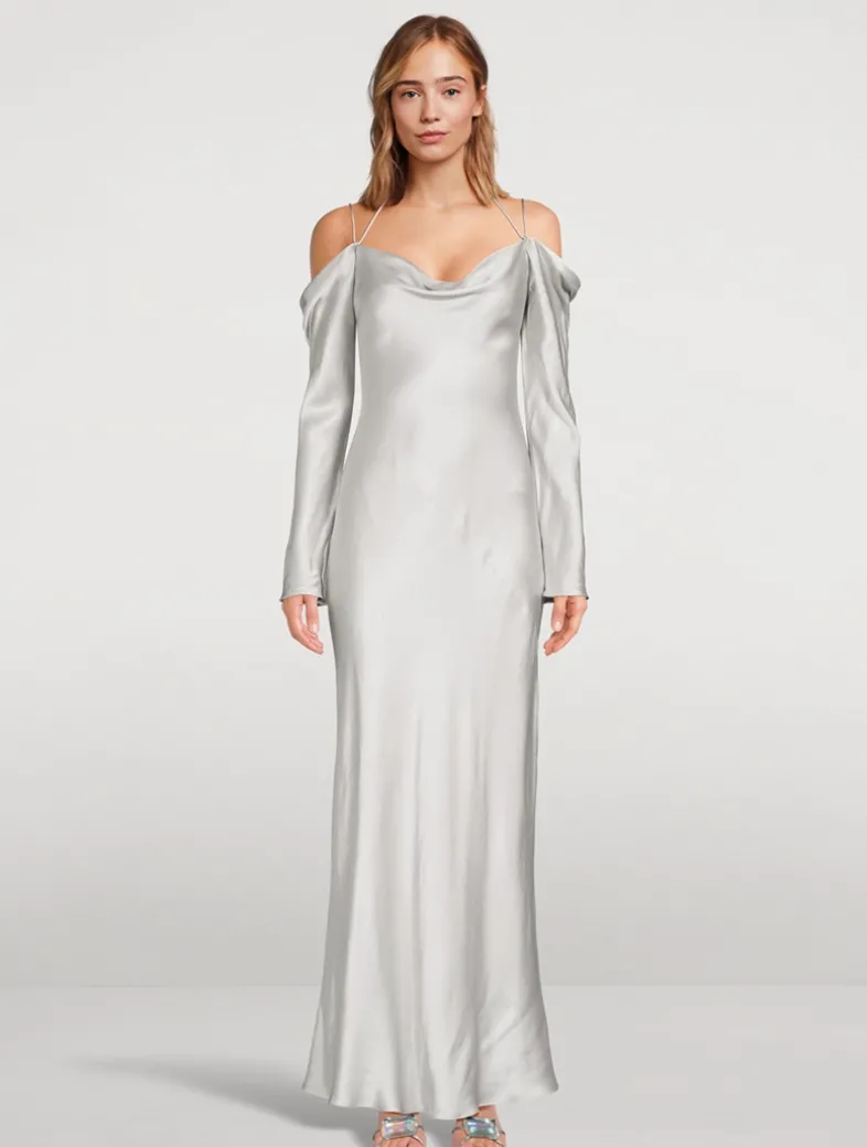 Cut in a curve-skimming silhouette, this bias satin dress has an asymmetric off-the-shoulder neckline with long draped sleeves and slim straps. Contributing to a cleaner environment, LENZING™ ECOVERO™ viscose fibres omit 50% less greenhouse gas emissions and utilise less water than conventional viscose.