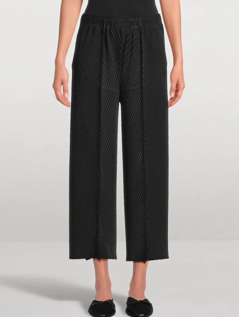 These pants are made with polyester crêpe de Chine fabric known for its soft texture and beautiful drape. The garment creates a flowing, soft form by pleating parts of the fabric. The pleats create a voluminous silhouette despite its lightweight feel and simple construction.