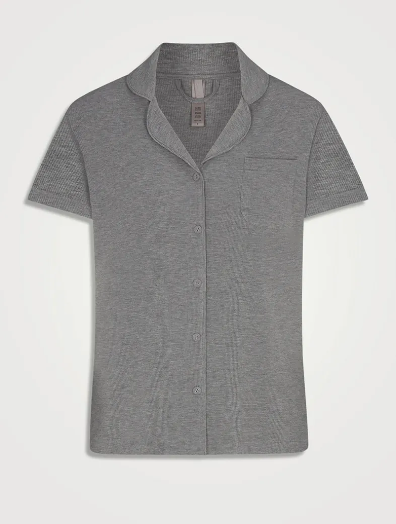 Meet the ultra-soft sleep set of your dreams. This classic button-up sleepwear top and fitted shorts have a classic look and ultra-comfortable feel. Features chest pocket details and interior drawstrings. Fits true to size.