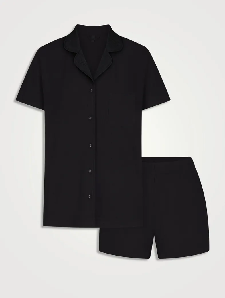 Meet the ultra-soft sleep set of your dreams. This classic button-up sleepwear top and fitted shorts have a classic look and ultra-comfortable feel. Features chest pocket details and interior drawstrings. Fits true to size.