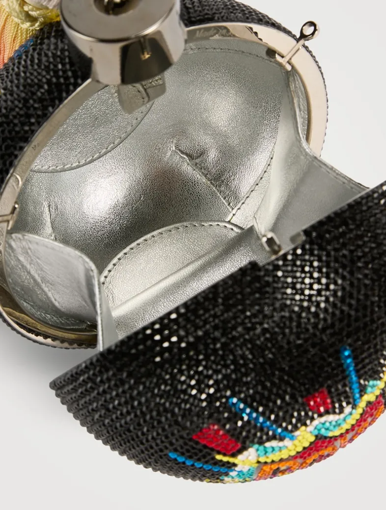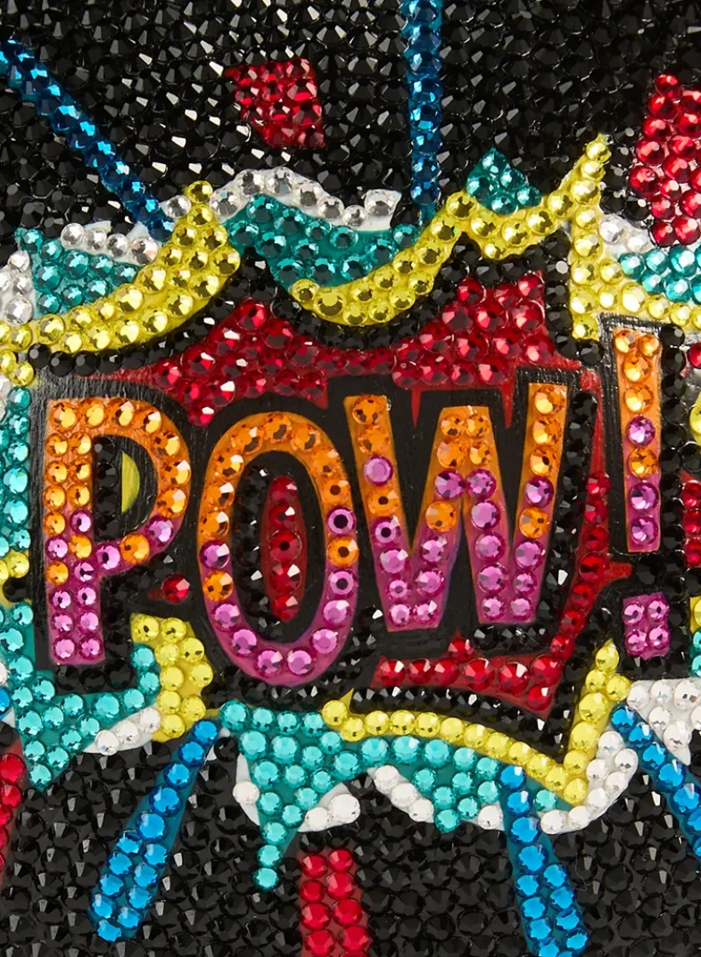 Make a style impact with the sphere-shaped Fuse crystal clutch featuring a unique chain-link wristlet and flaming tassel. Finished with a whimsical POW design and a metallic leather interior.