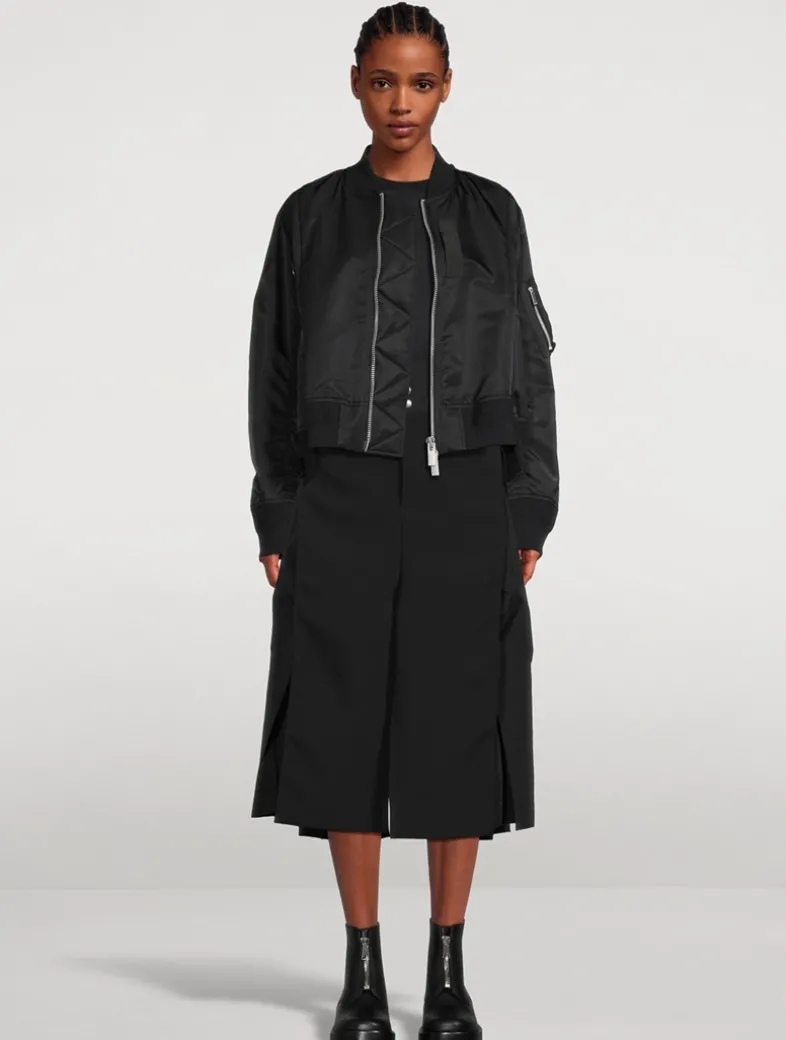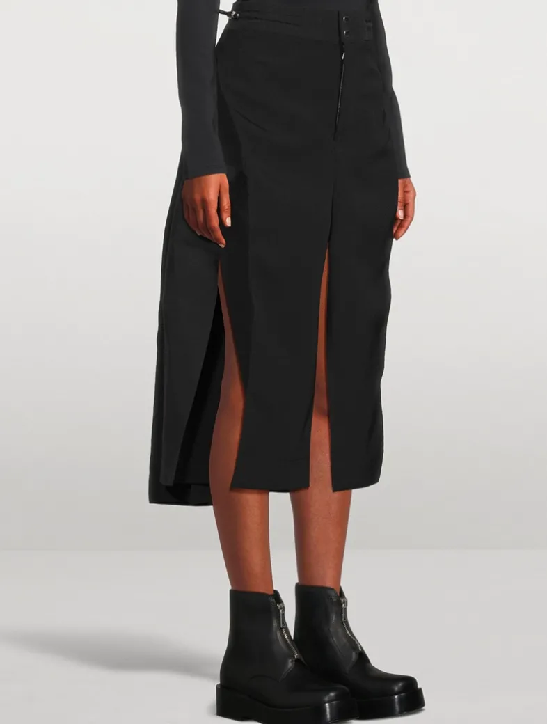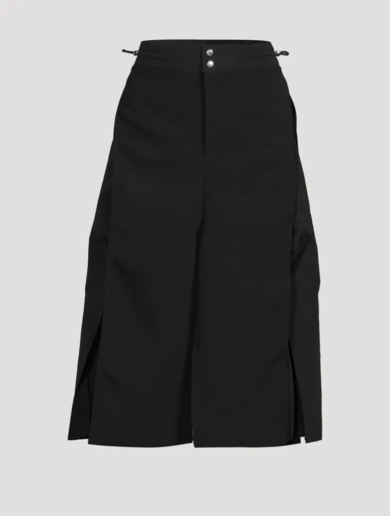 These trousers are cut to a wide-leg silhouette with extra-long slits at the sides to enhance their fluttering shape. They have a high-rise waistband detailed with adjustable drawstrings. Finished with welt pockets at the rear.