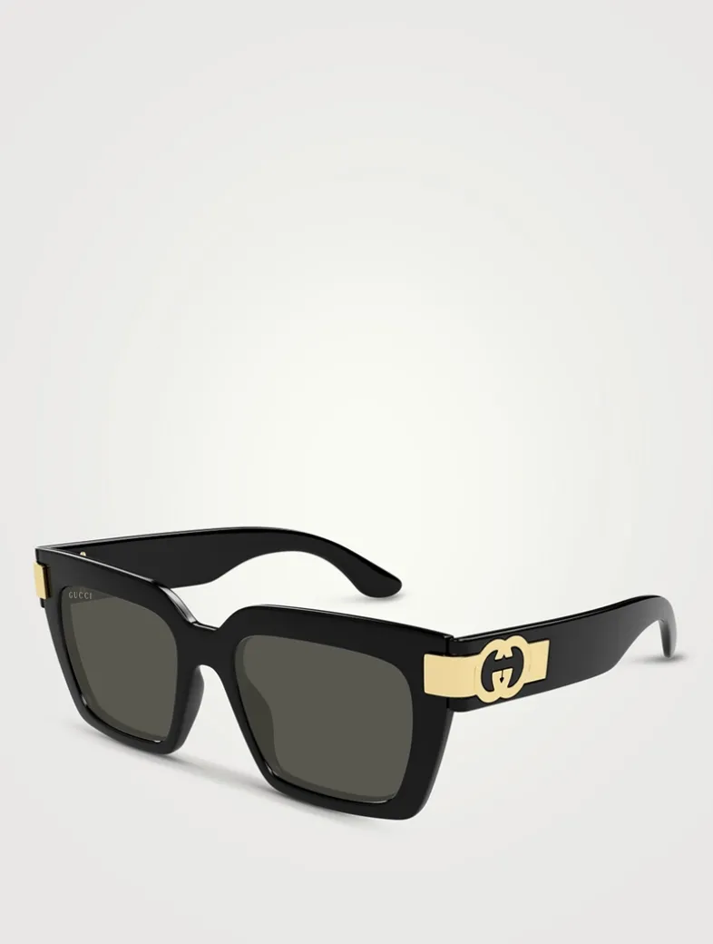 This Gucci eyewear collection combines the coveted silhouettes of bygone decades with a contemporary logo feel. These oversized square sunglasses are punctuated with Interlocking G motifs at the temples.
