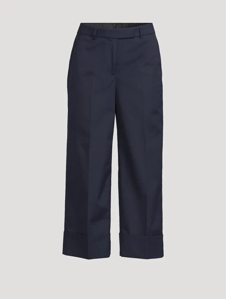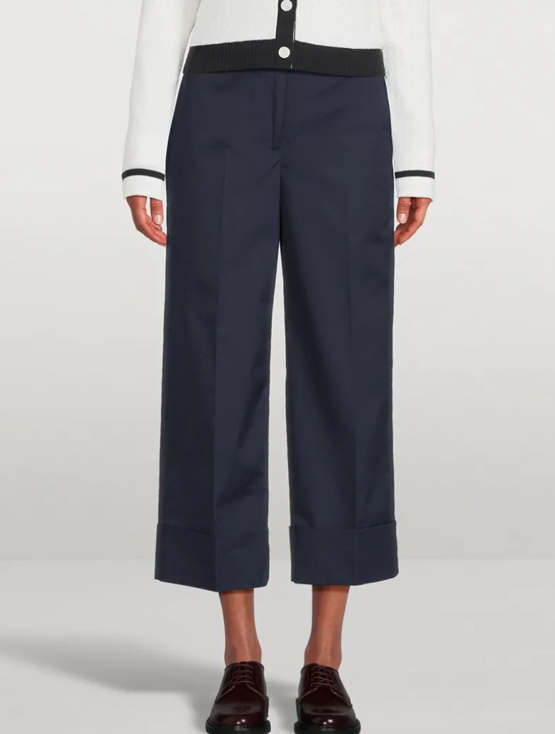A sophisticated trouser with a shortened hem and folded cuff that pays homage to Thom Browne’s distinguished tailoring. Made in Italy from a lightweight cotton blend with pockets at the sides and rear.