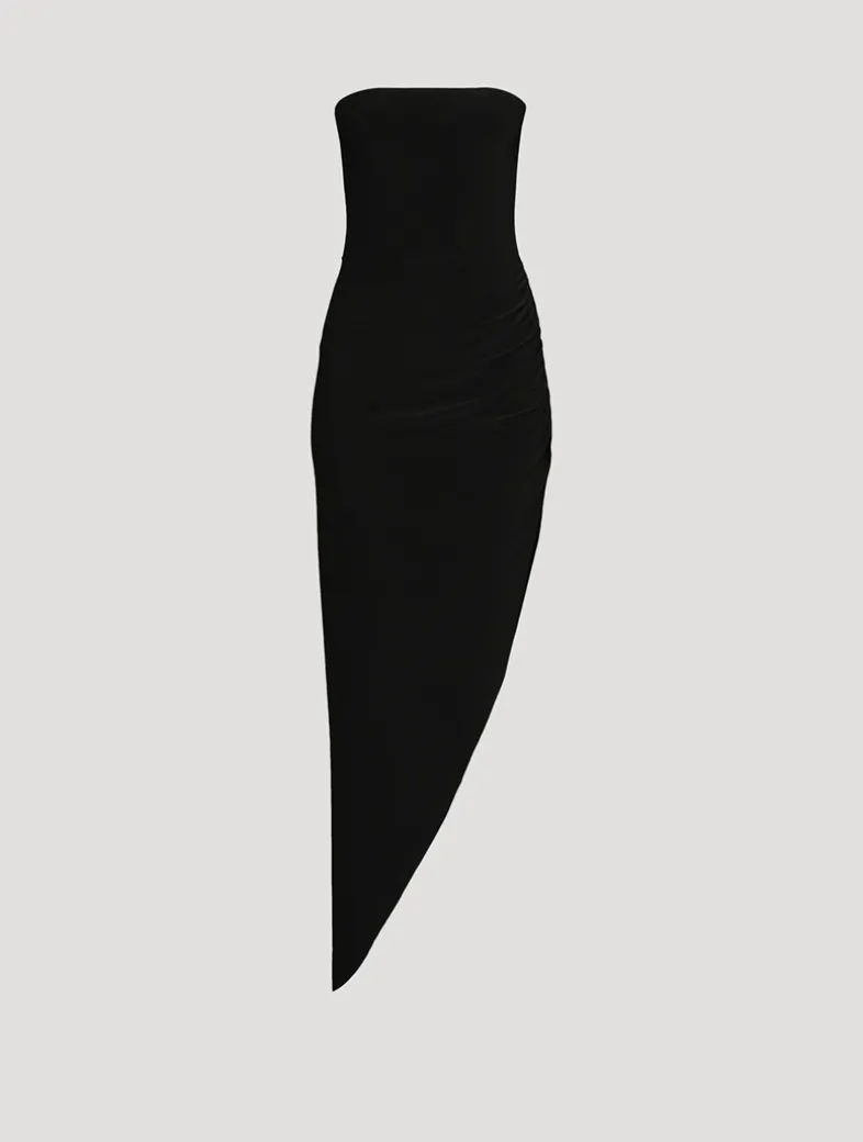 Flaunting a squareneck design, this strapless dress is designed with soft, asymmetric ruching at the waist and thigh-high side slit detailing. Finished in a pullover, fitted silhouette.