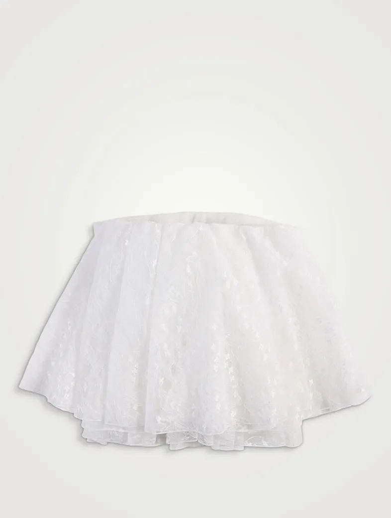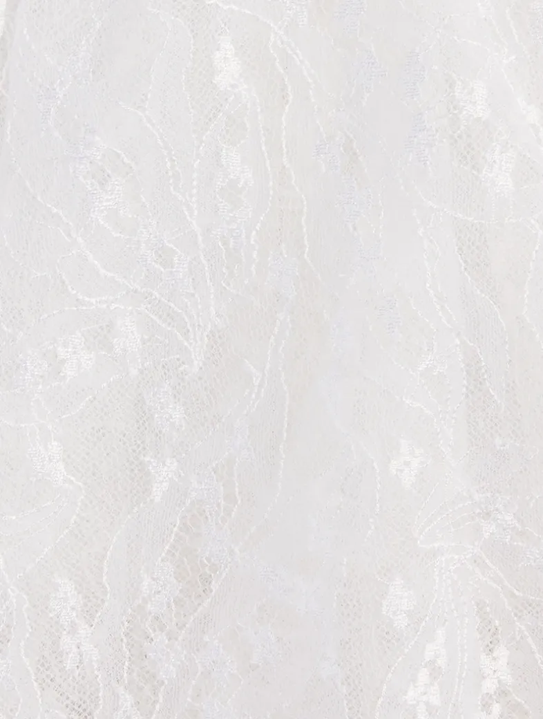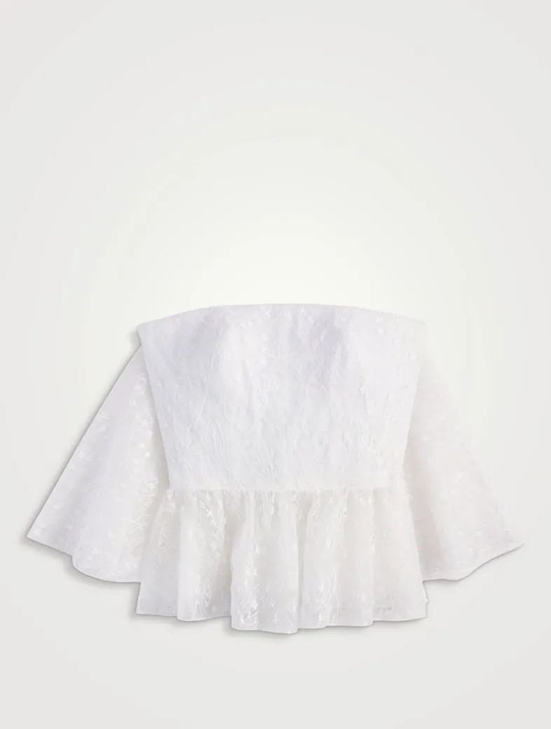 Exuding a delicate and romantic look, this strapless top is crafted from lily of the valley French lace. It is detailed with a matching cape on the back, a ruffled peplum, and an integrated corset for the perfect fit.