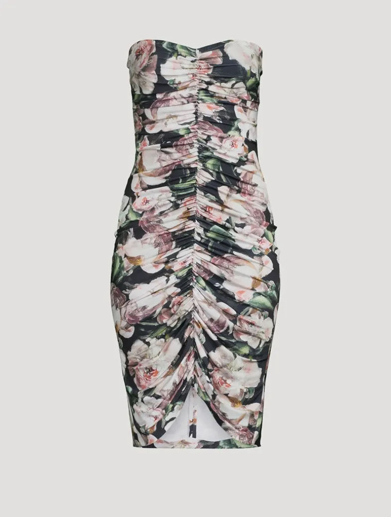 A lovely floral motif lends a romantic touch to this strapless dress. It has soft ruching running down the front creating an asymmetric hem.