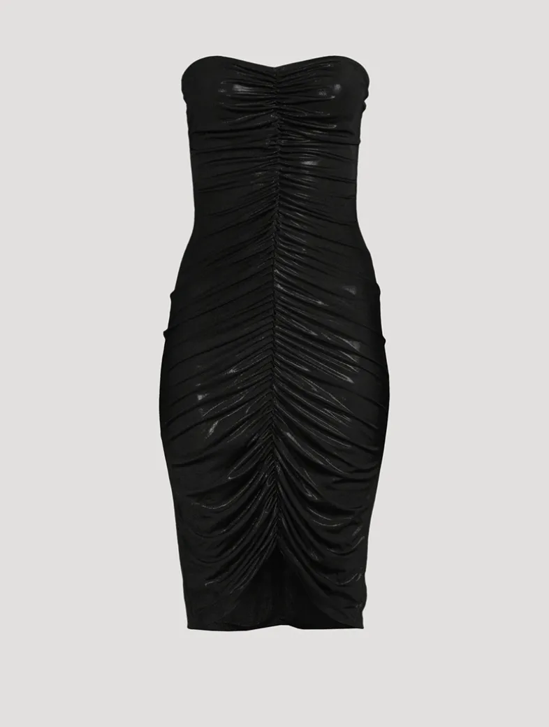 Topped with a feminine sweetheart neckline, this fitted dress is designed with shirred detail at the center front and a smooth panel at the back. Crafted from a stretch fabric, this strapless midi is finished with a lamé shimmer.
