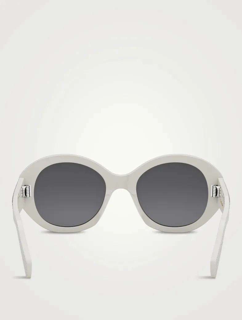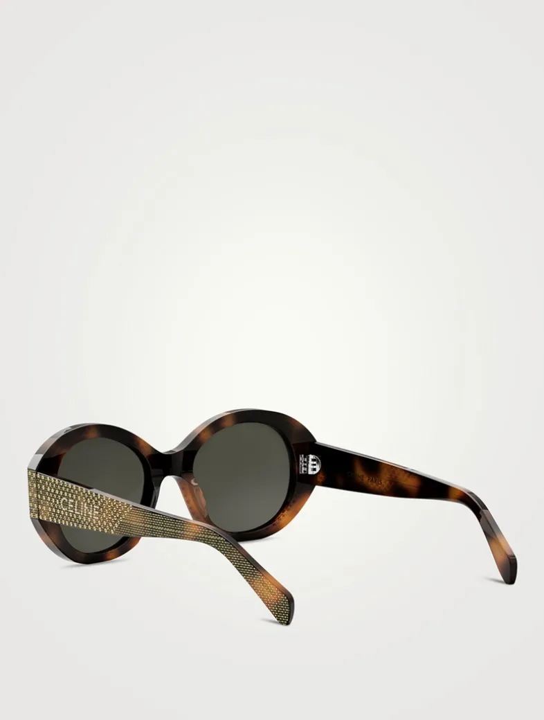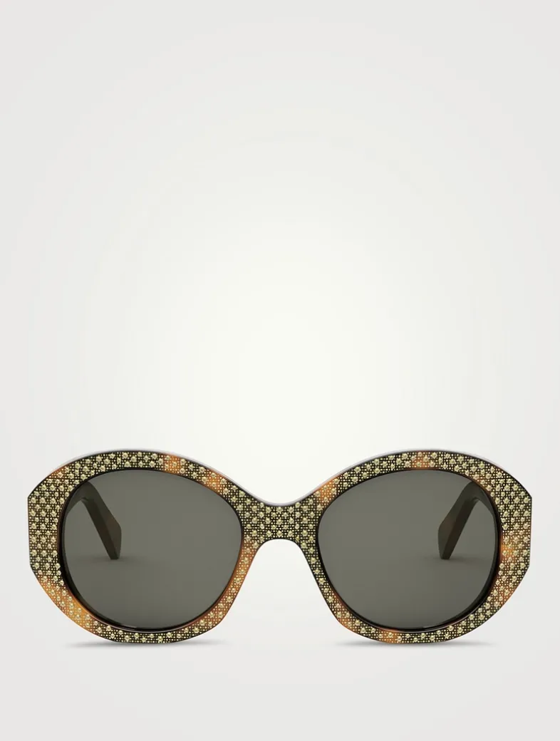 The round, graphic shape of these sunglasses is highlighted with sparkling strass gems. CELINE logo lettering further enhances the temples.