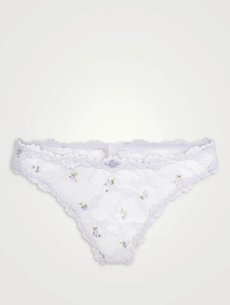 This sexy and feminine sheer lace-adorned dipped front thong is the next addition to your top drawer. Features a rosette detail at the center front, a thong back with minimum coverage, and a cotton gusset. Fits true to size.