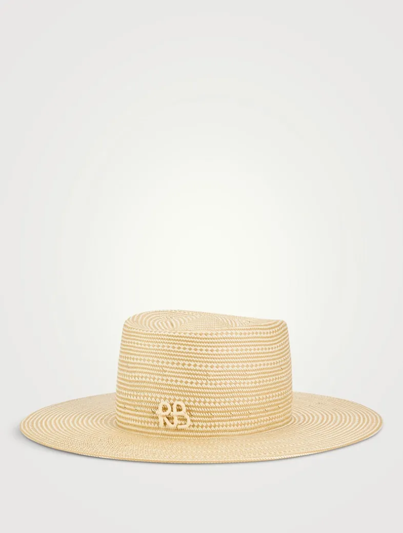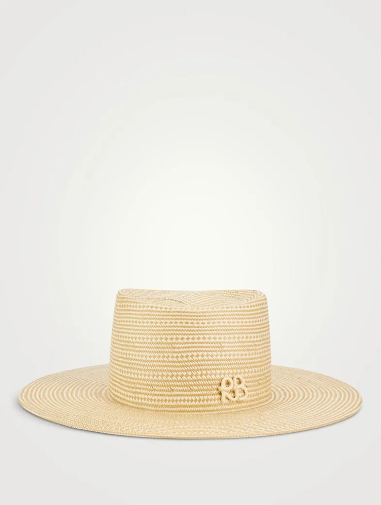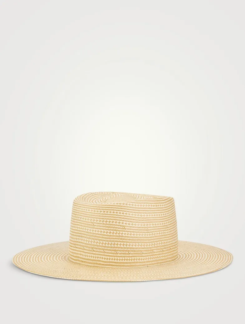Crafted by hand in Ukraine from 100% straw, this artisanal gambler hat is patterned with stripes.