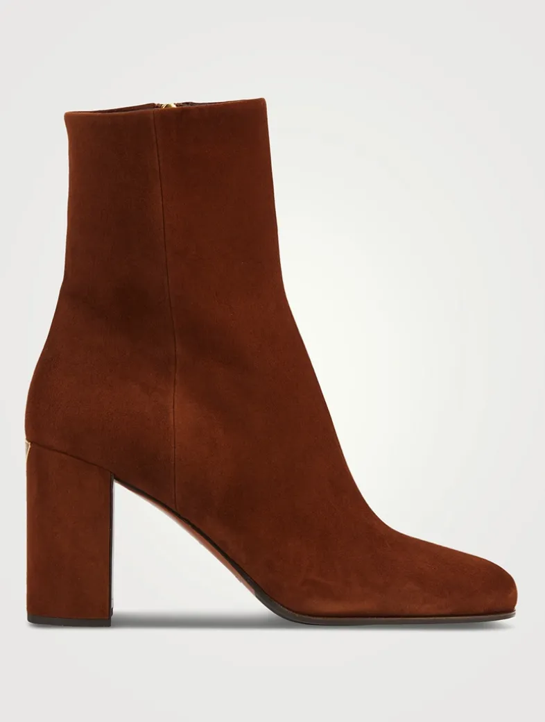 The sleek, refined design of these booties is emphasized by the soft touch of suede that adds a versatile and contemporary character to the footwear. Set on a suede-covered block heel with enamelled metal triangle logo.