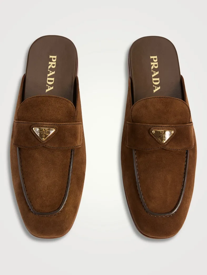 These mules are made of soft suede. The enamelled metal triangle logo embellishes the band, while the rubber sole adds a casual and versatile note to the design.
