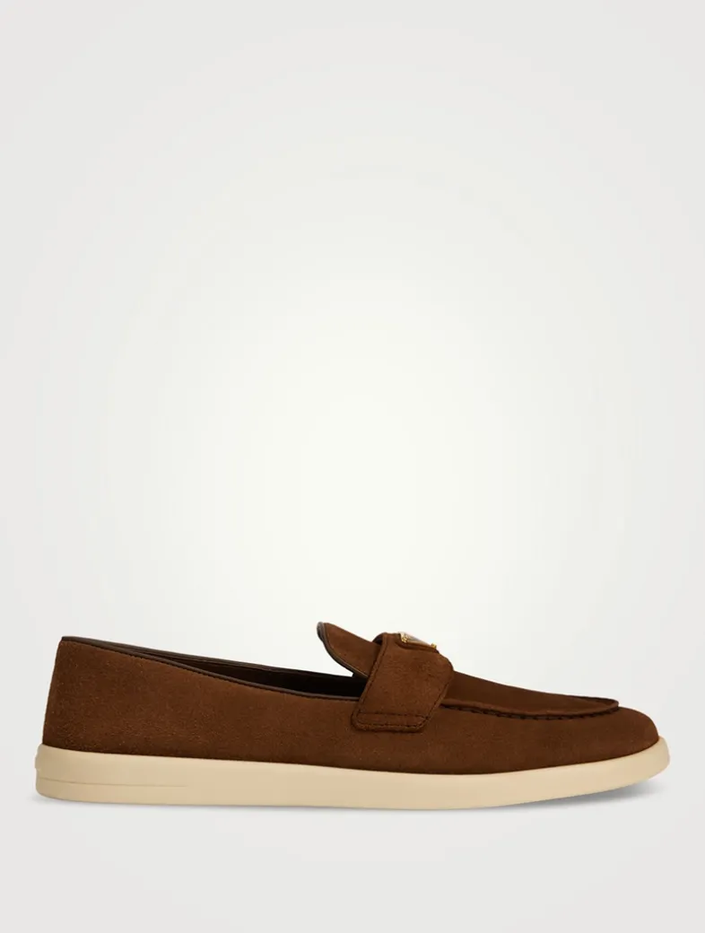 These suede loafers with classic charm feature a pinched stitch seam on the upper and are decorated with the enamelled metal triangle logo.