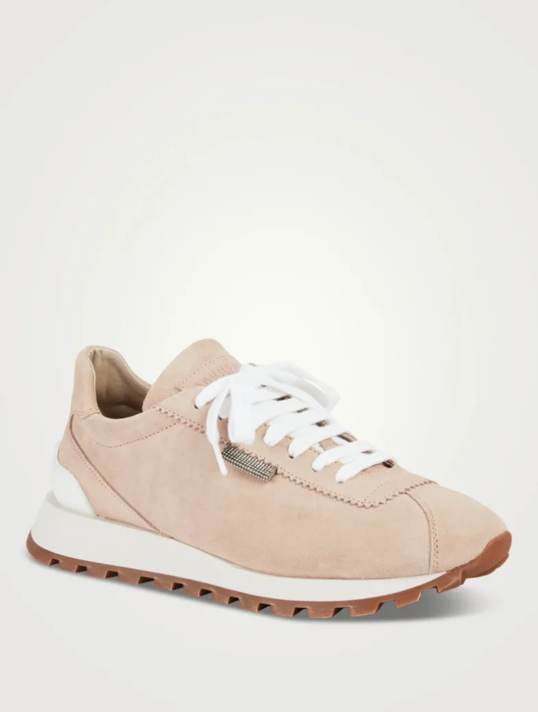Refined materials and iconic details characterize these new suede sneakers. Their velvety texture brings out the colour of the season, while the label in shiny monili, the iconic embellishment of the BRUNELLO CUCINELLI collections, adds a sparkling note. The cotton-blend fabric lining and the rubber outsole provide the fit with added comfort.
