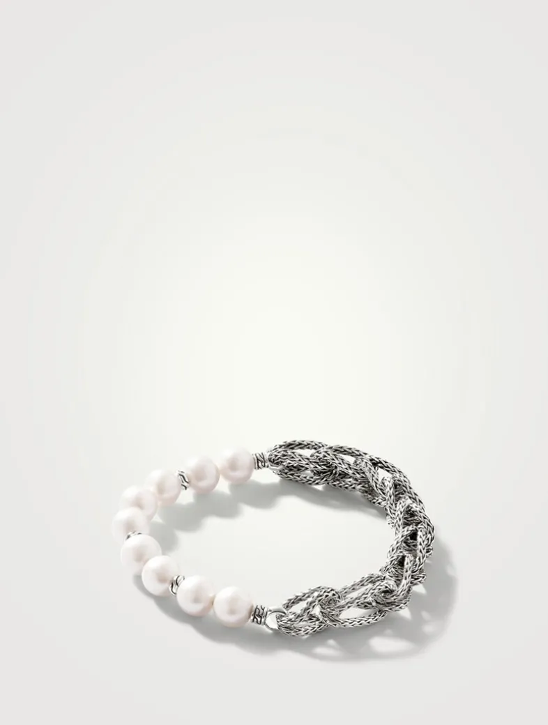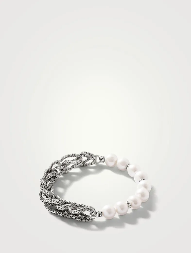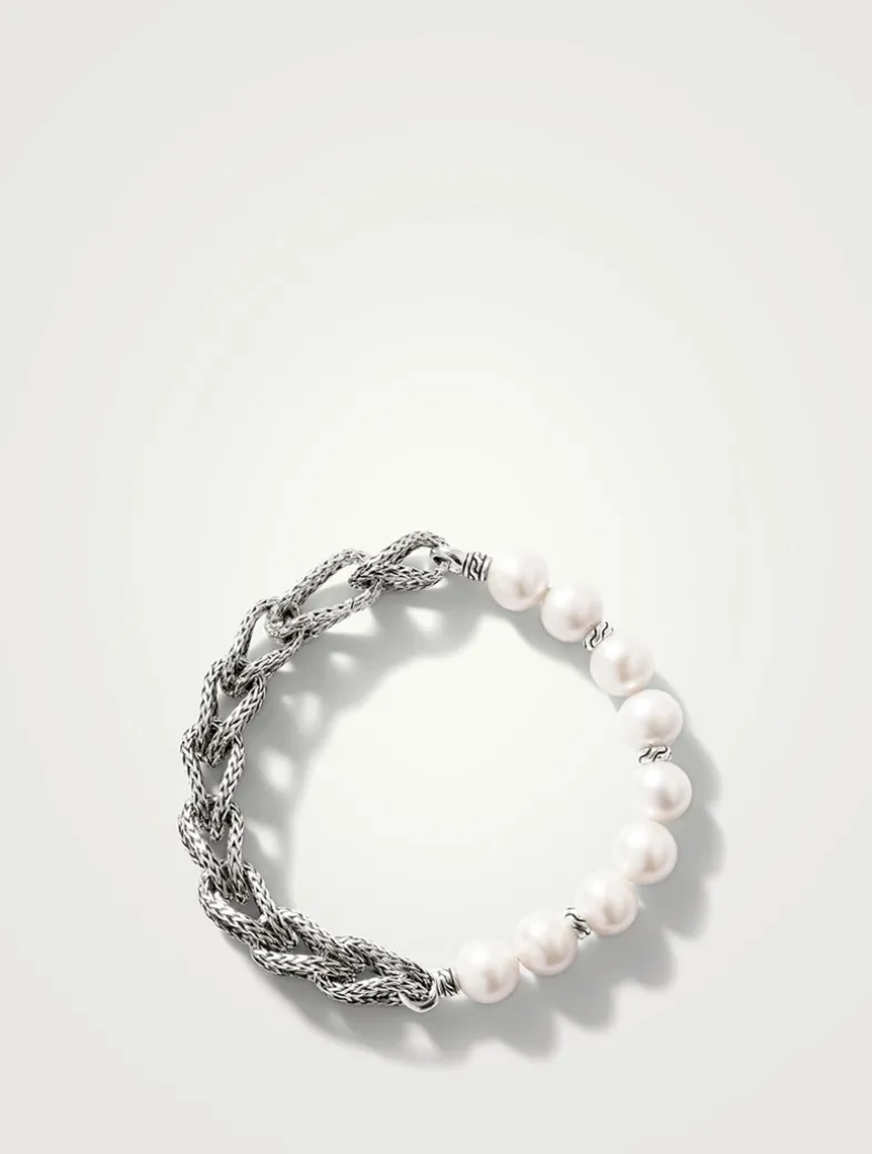 Classic with a twist, this artisan-handcrafted piece pairs sterling silver links with lustrous freshwater pearls.