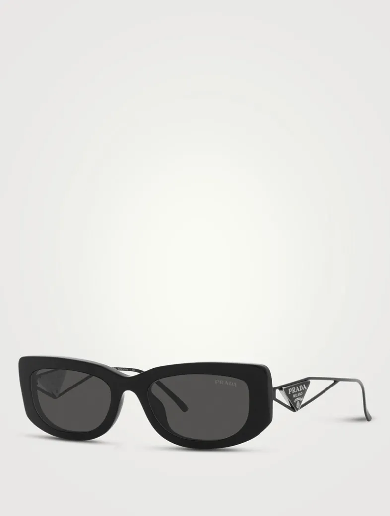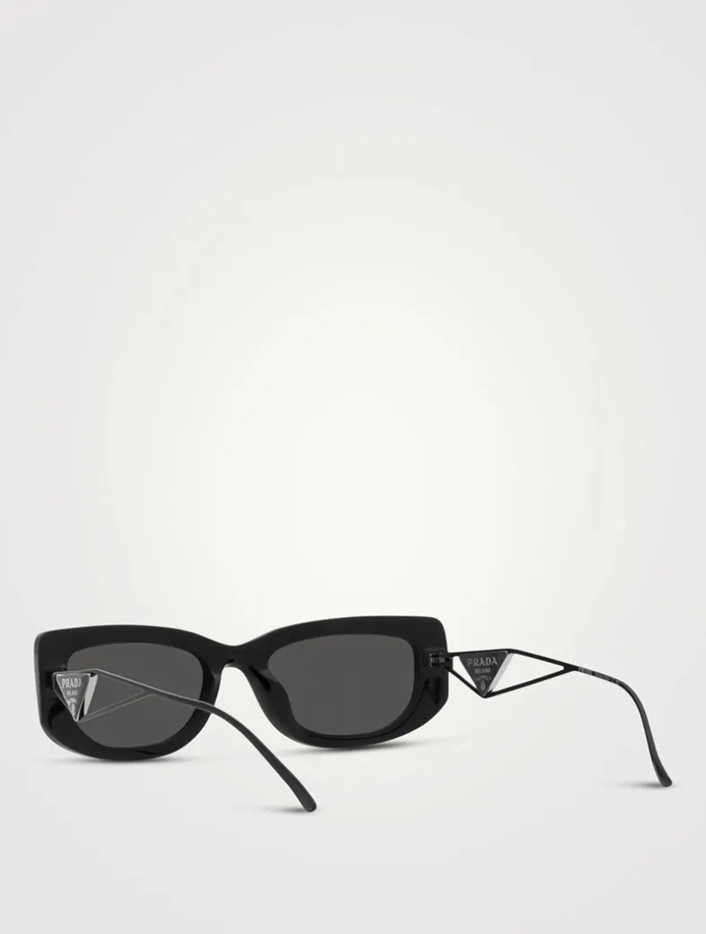 These rectangular sunglasses feature open metal temples decorated with PRADA triangle logo inserts inspired by the maison’s jewellery.