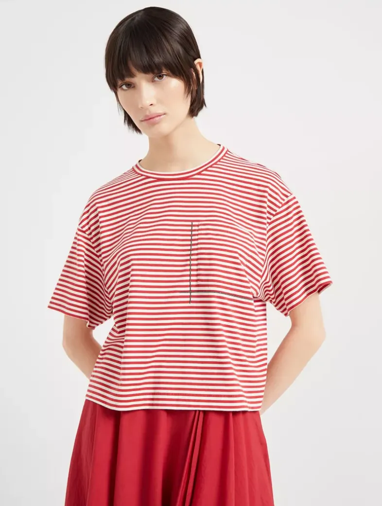 Cotton striped jersey cropped t-shirt with shiny pocket detail