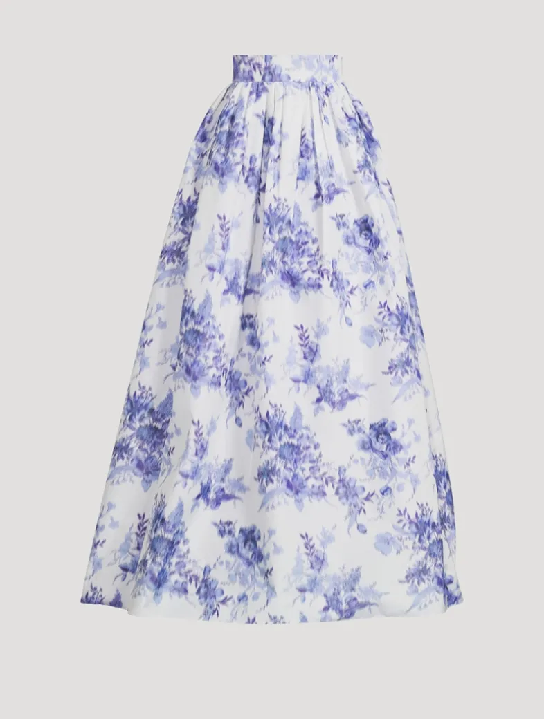 Inspired by the serene elegance of Delft porcelain, this voluminous taffeta skirt is printed with a vintage-inspired floral motif. Chiné printing gives the pattern a soft, blurred finish. Cut to a high-rise waist finished with side pockets.