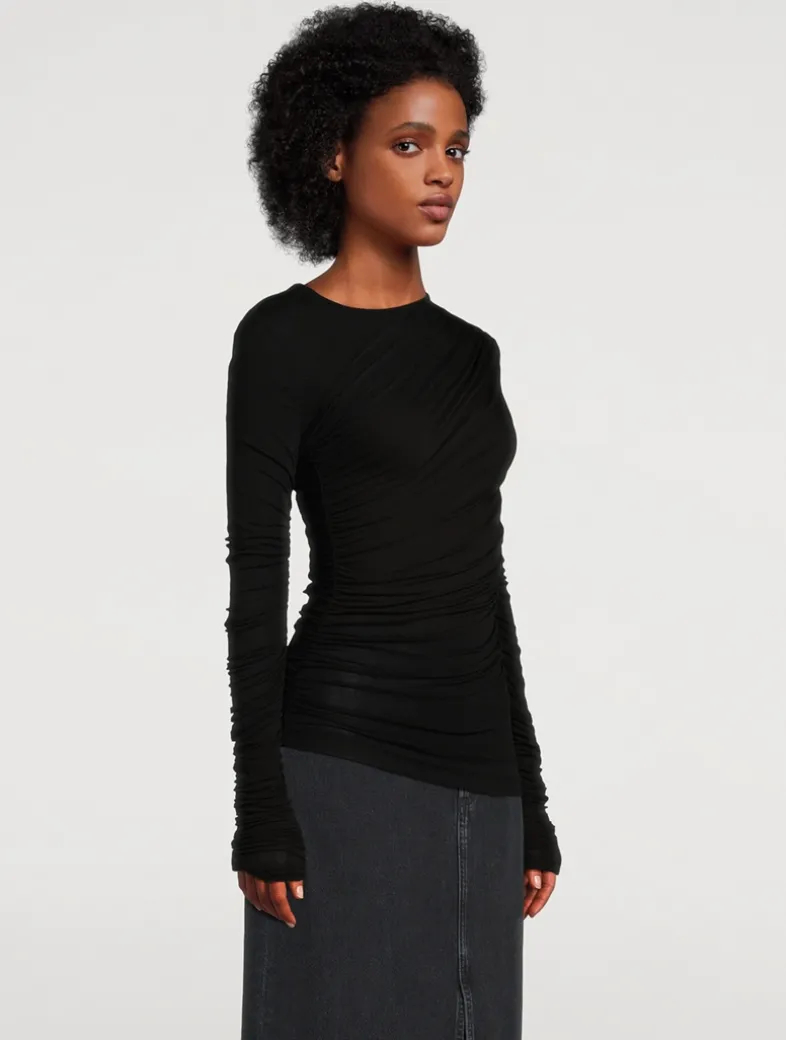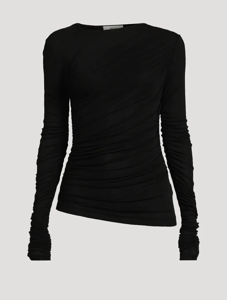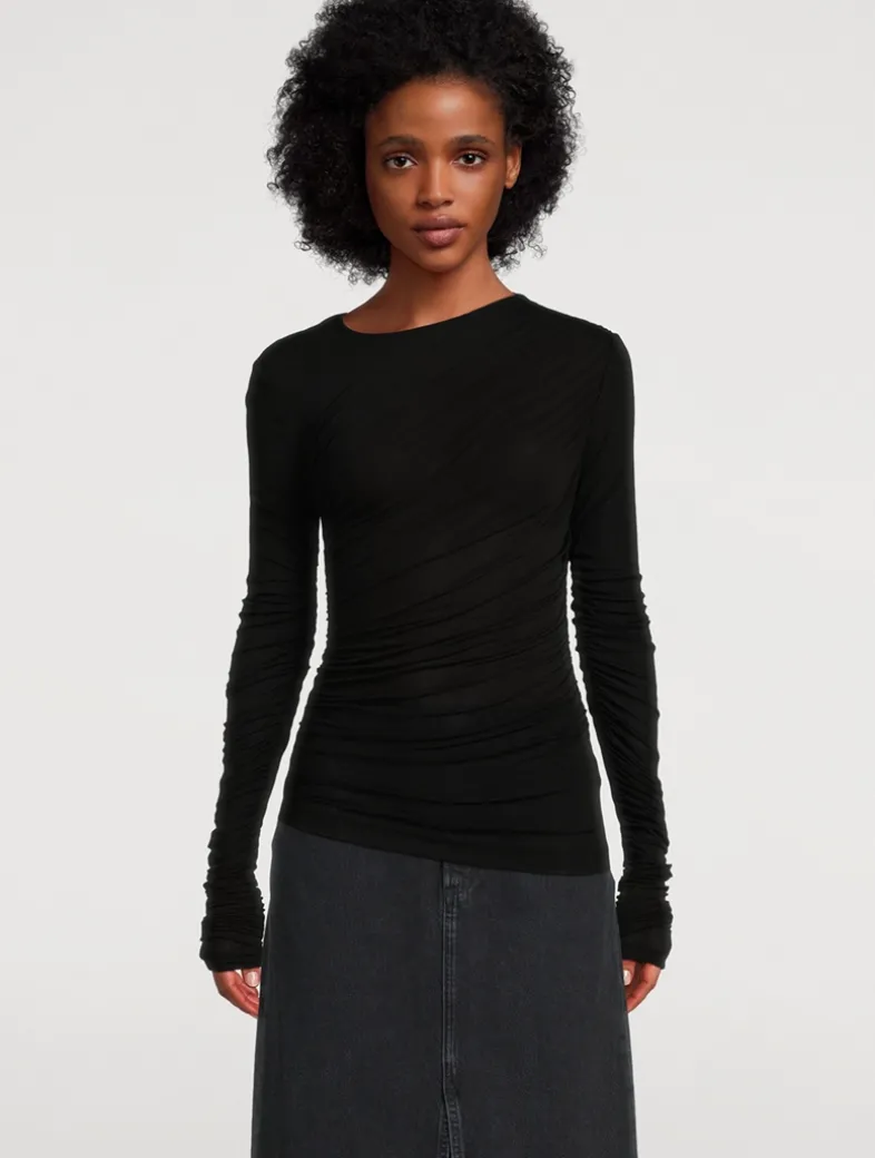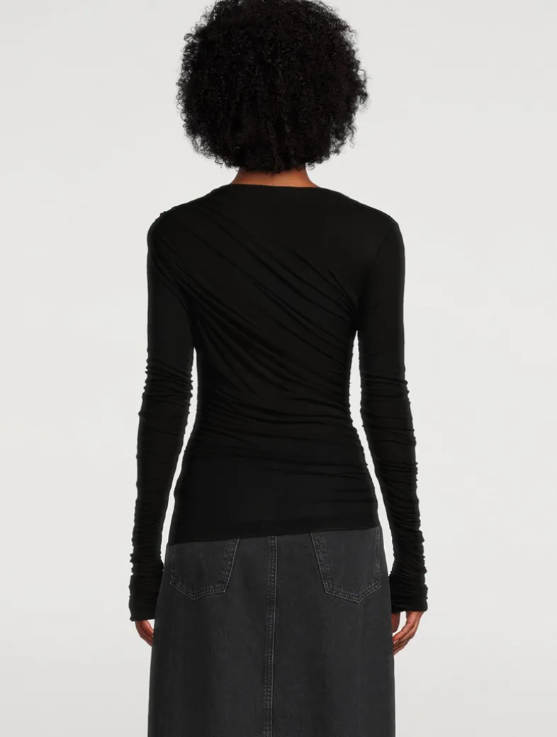The Tania twist tee highlights texture and form. This slightly-sheer top is made from ultra-soft, lightweight fine needle baby rib and designed with a slim fit and draped gathers.