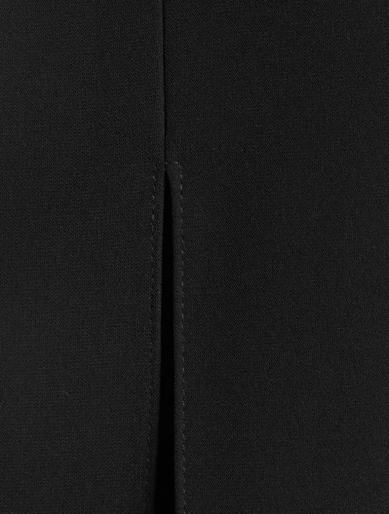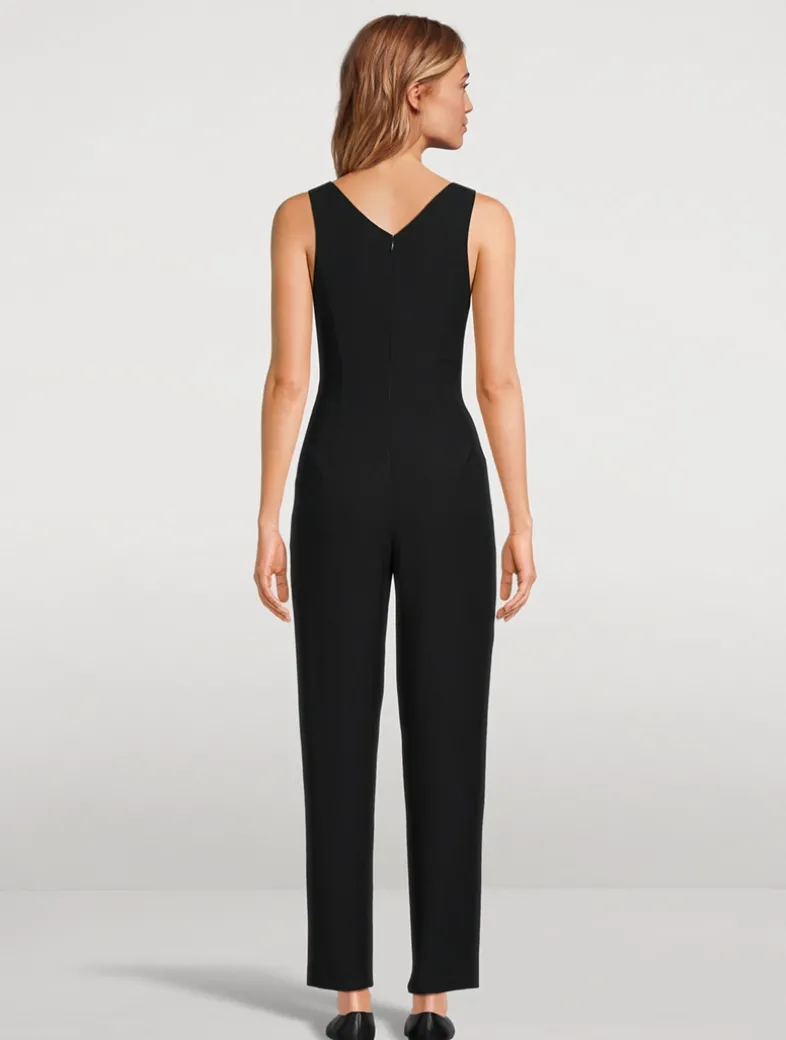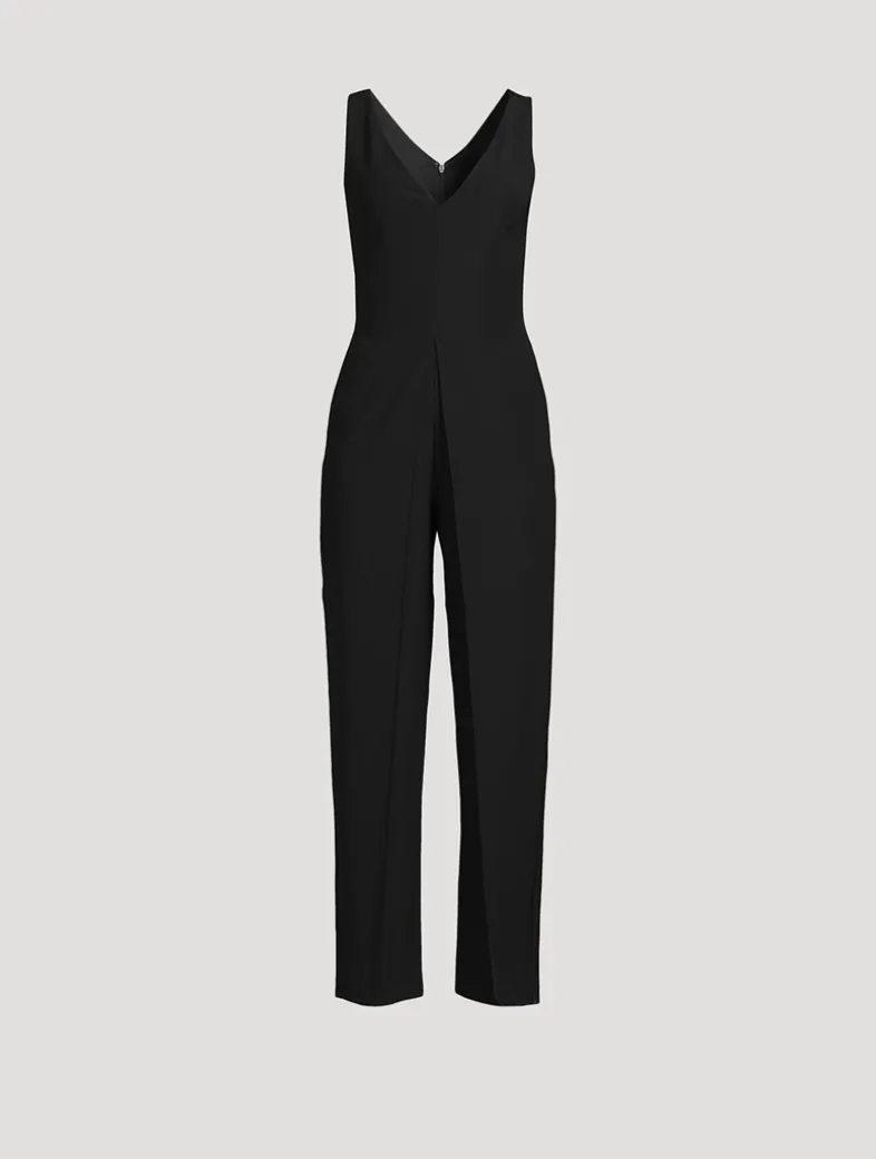 This sleeveless jumpsuit, designed with a deep V-neckline, is enhanced by the refined technical cady which, fluid and lightweight, delicately skims over the skin, offering an impeccable look for any silhouette.