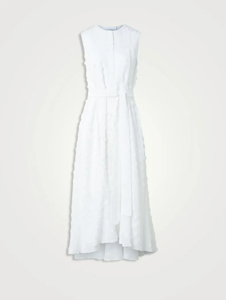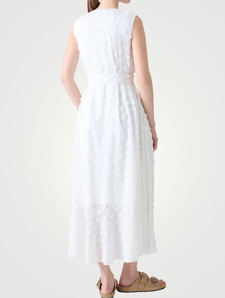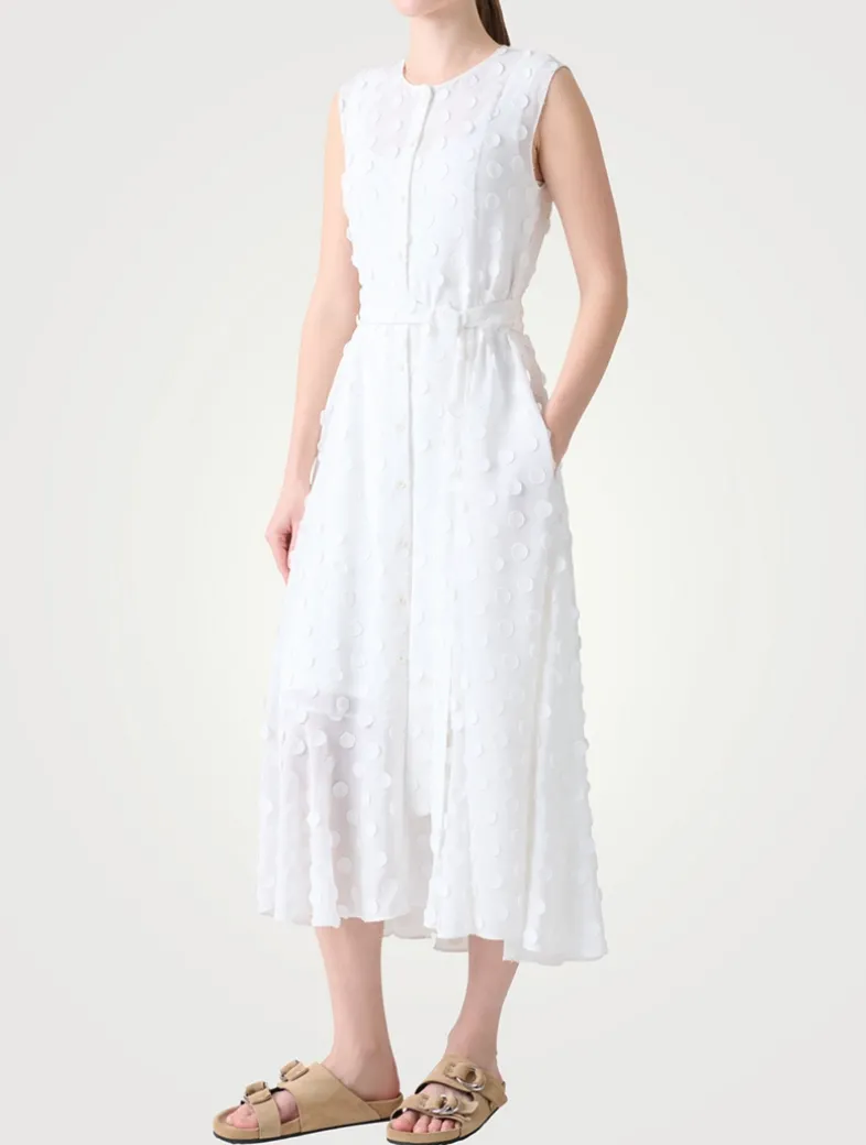 Highlighted with a knotted sash belt, this sleeveless shirt dress features a button-front closure and mid-calf hem. It is crafted from a techno georgette with a tonal 3D polka dot motif allover.