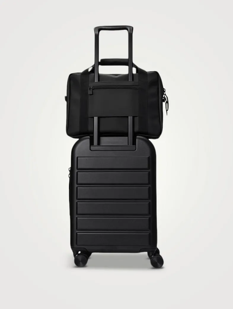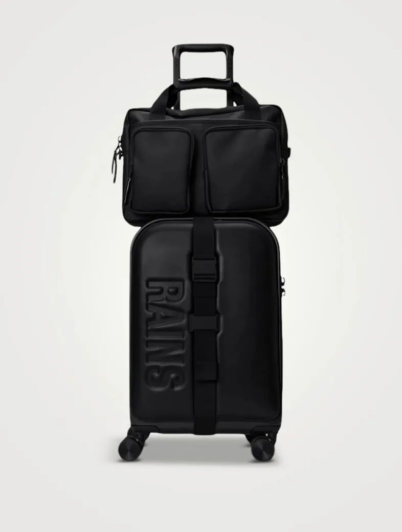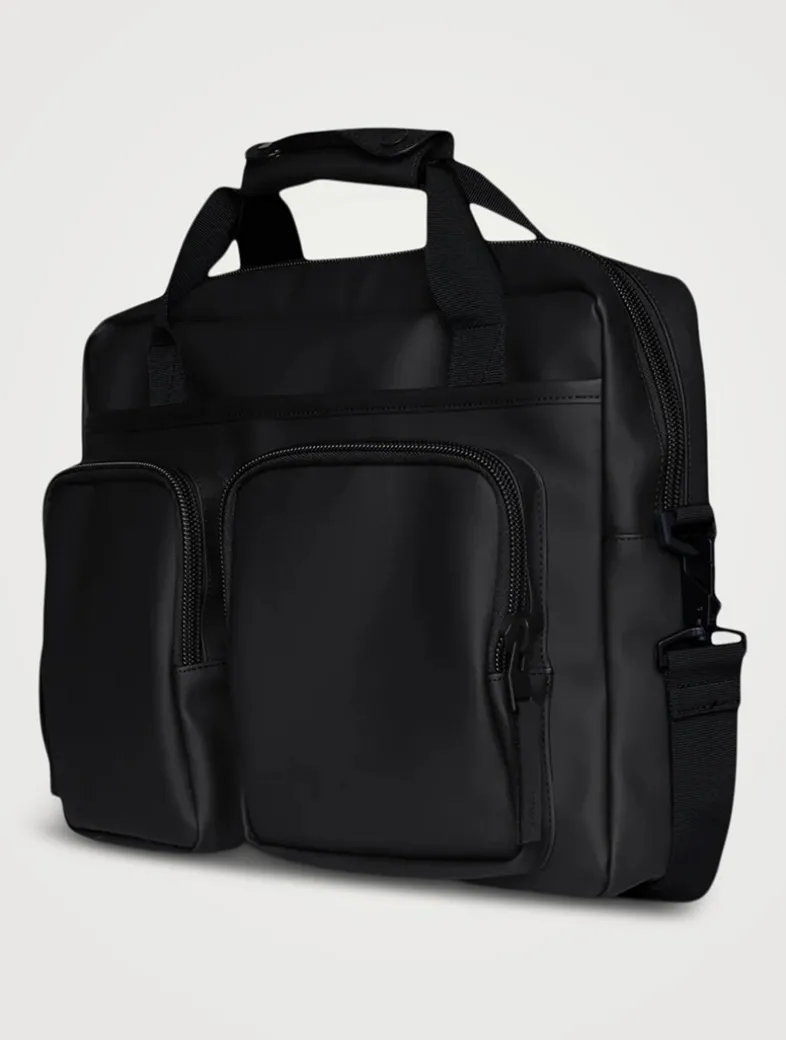 This functional waterproof laptop bag is designed with a padded sleeve for a 15” laptop, zip and mesh pockets, and a large zip pocket for small tablets and notebooks. Cut from RAINS’ signature waterproof PU fabric, this waterproof tech bag features various zips and prominent front utility pockets. Finished with a back-mounted trolley sleeve, webbing carry handles, and a detachable shoulder strap.