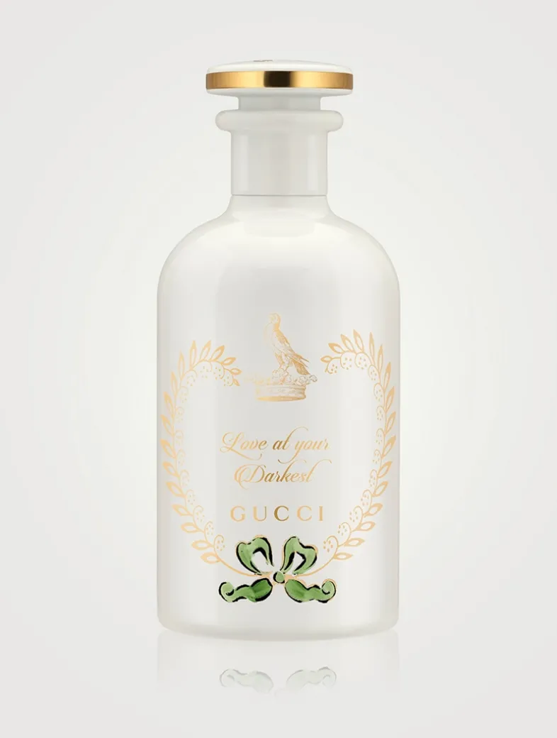 Love shines through the darkness like a hawk cutting through the sky with ‘Love at your Darkest’ Eau de Parfum for men and women, a deep woody and spicy perfume fragrance that is an enveloping combination of Black Pepper, Incense and Cedarwood. This Gucci ‘Love at your Darkest’ perfume fragrance is built around a hero ingredient linked to the distinctive codes of the House, and formulated to be layered together to create unique, personalised Gucci scent combinations. There are several recommended combinations for Love at your Darkest, one of which is to mix with the perfumed water Fading Autumn for an intense and creamy woody aroma.