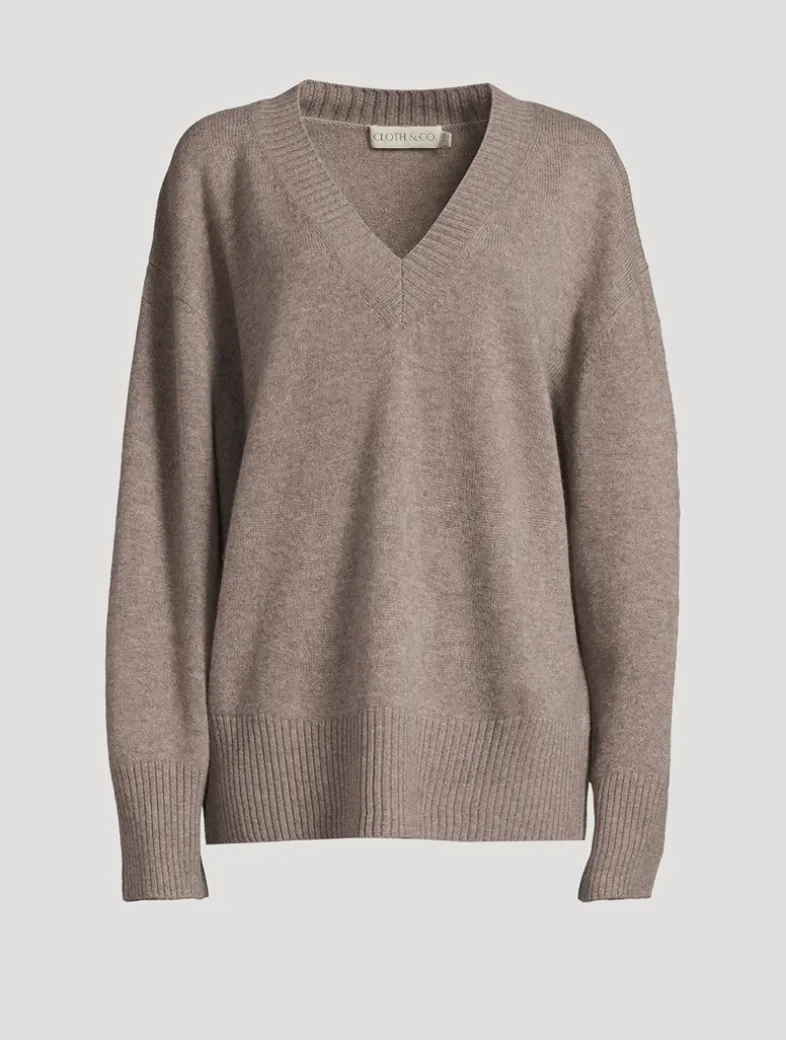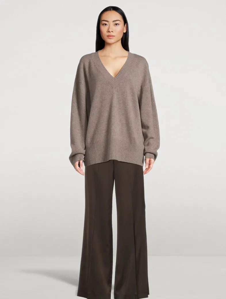 Timeless and understated, this V-neck sweater is crafted from a luxurious blend of 90% ultrafine merino and 10% cashmere. With a flattering V-neck and relaxed fit, it’s soft, breathable, and perfect for effortless layering year-round.