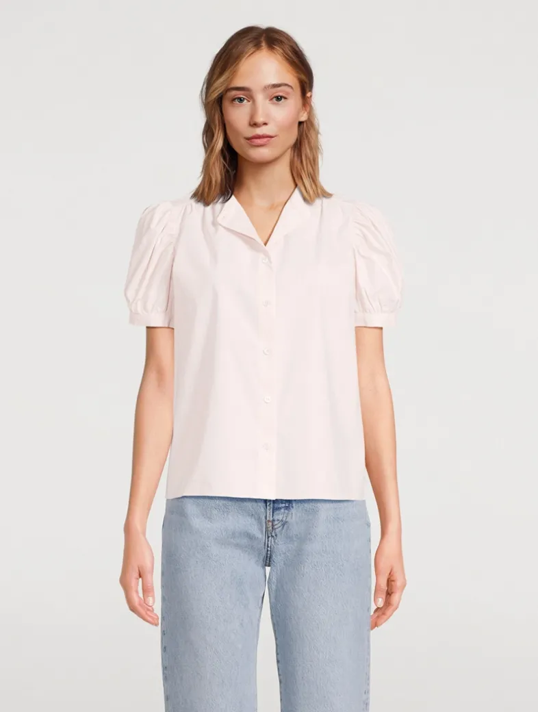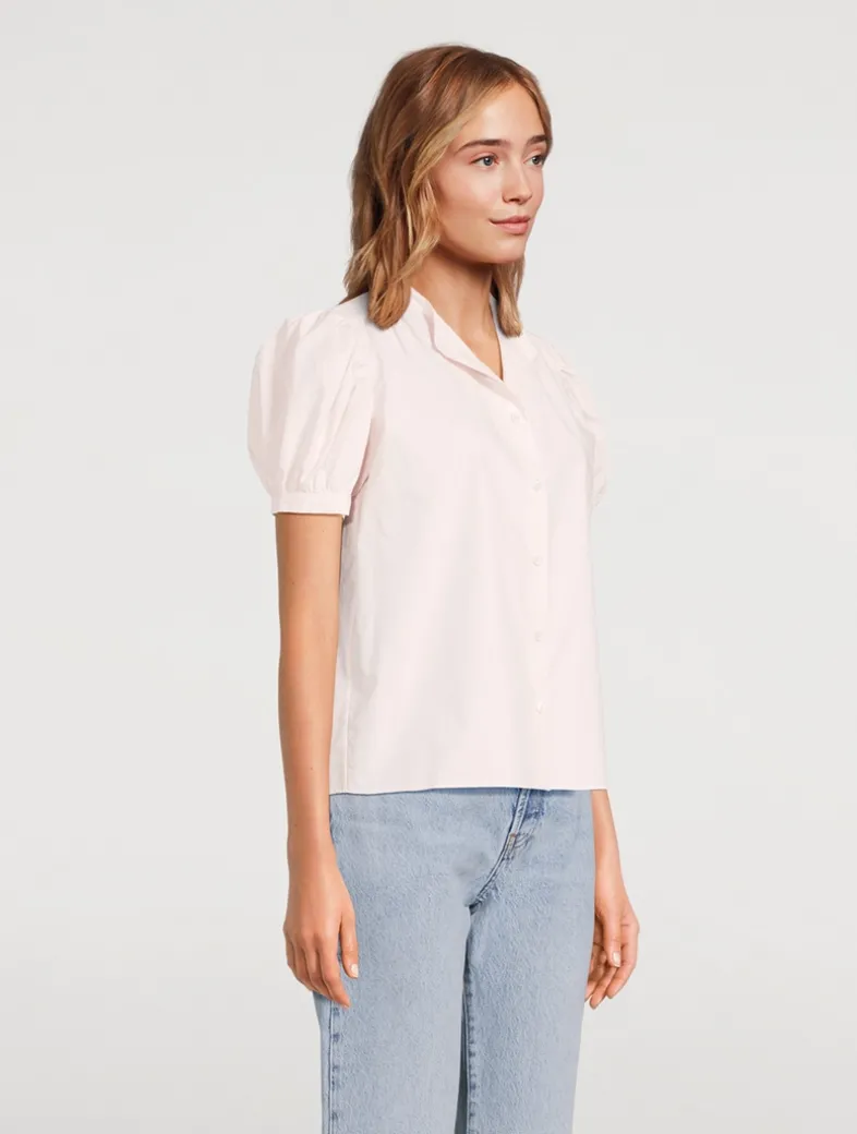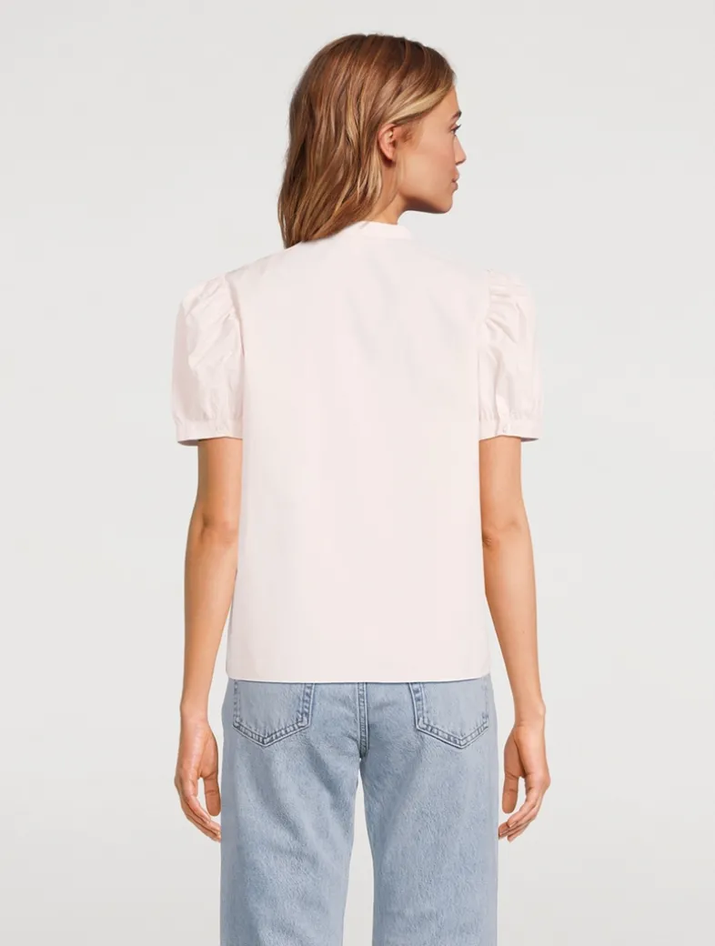 Quintessentially FRAME, this organic cotton poplin top has short puff sleeves enhanced by gathered detailing. Feminine, yet polished, the blouse also features a round banded collar.
