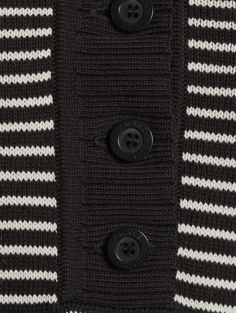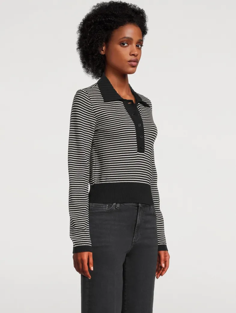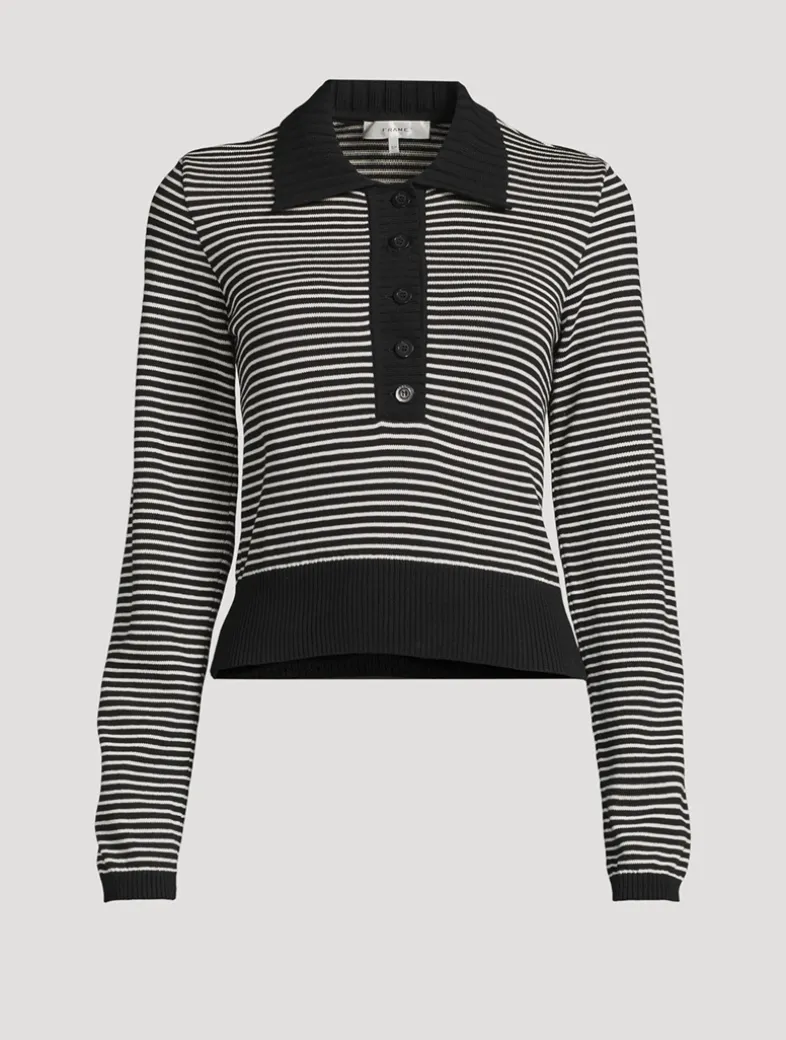 This 100% cotton knit takes cues from campus classics, reimagined with a polo collar and chic stripes. The contrast trim, fine ribbed texture, and FRAME-branded buttons complete the look.